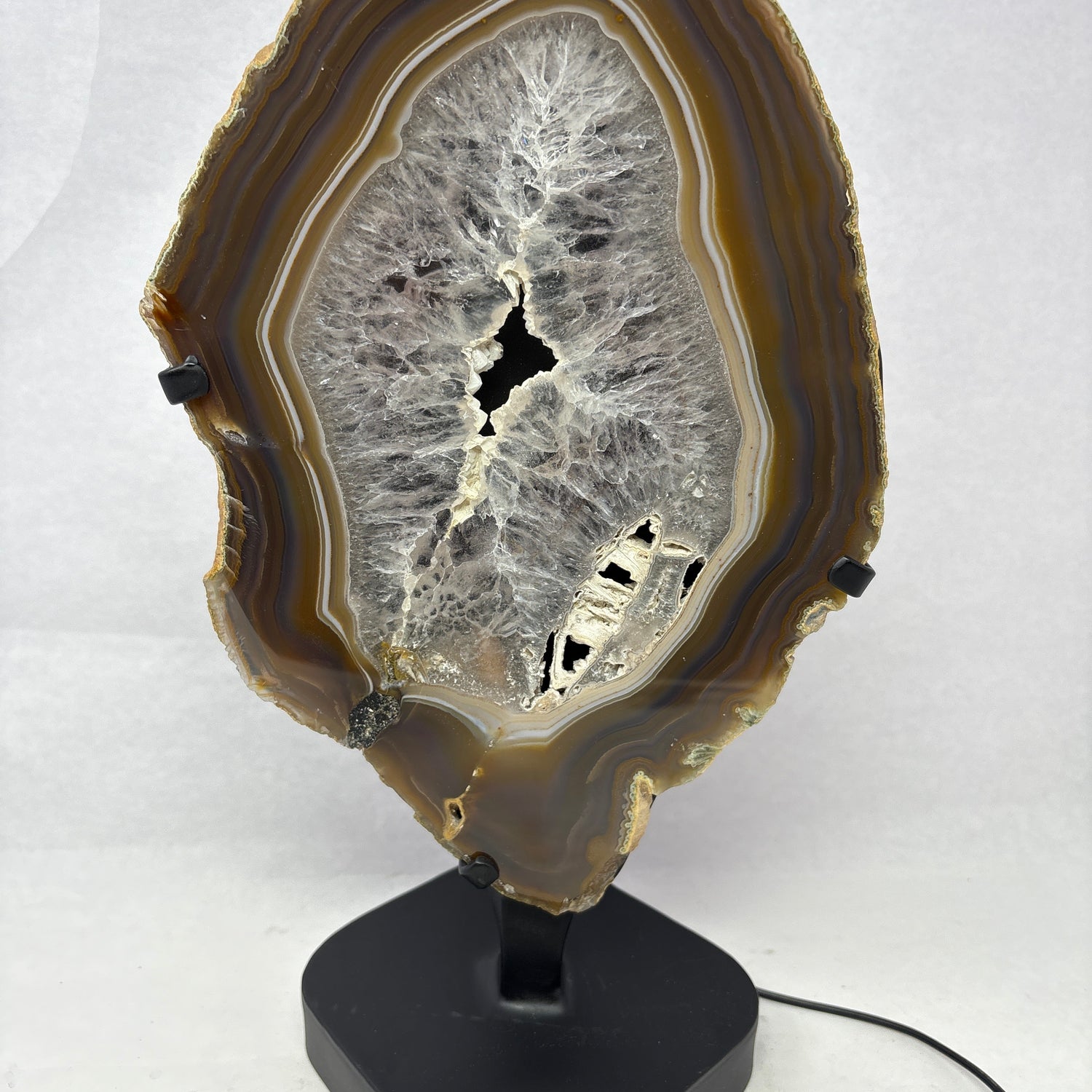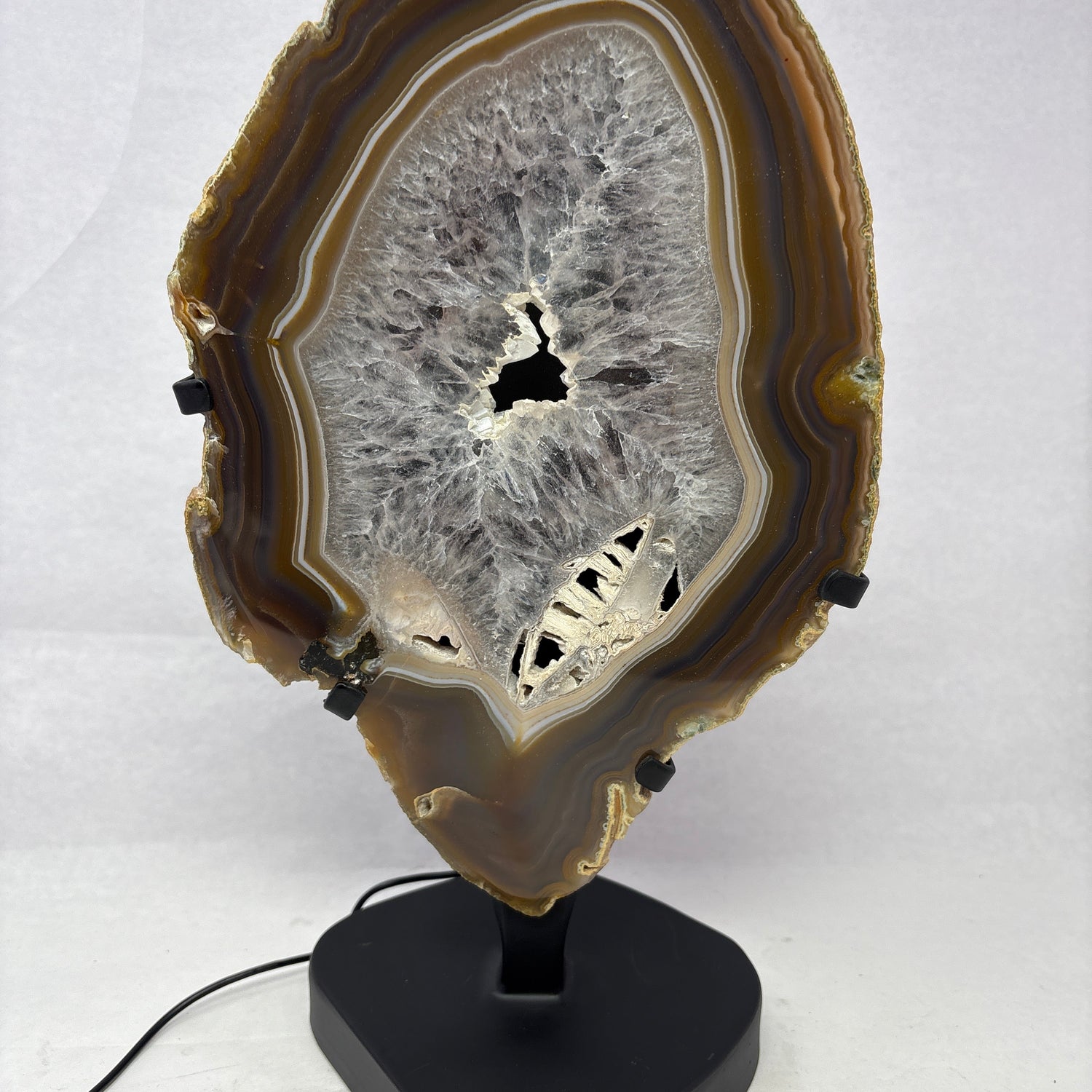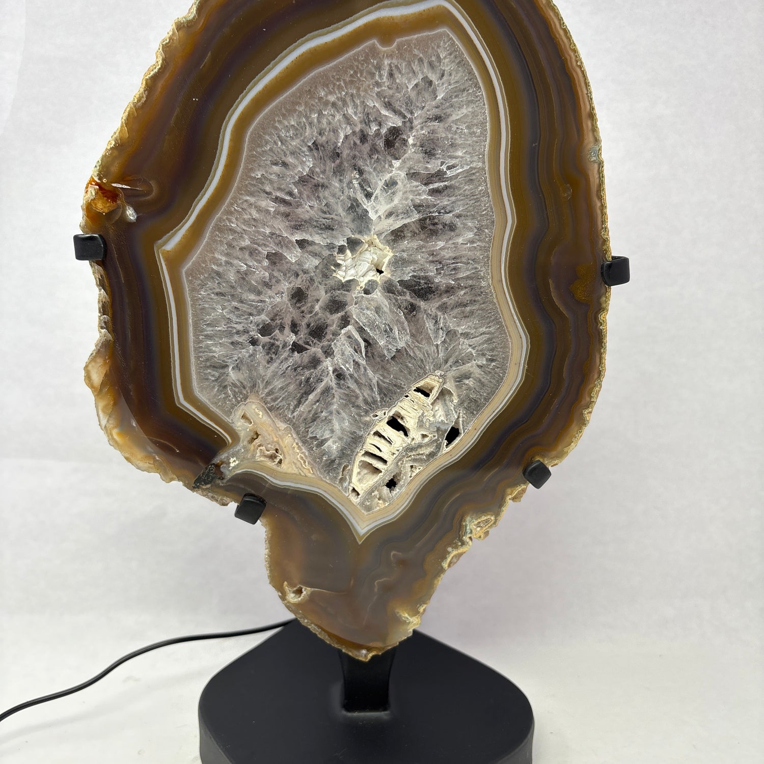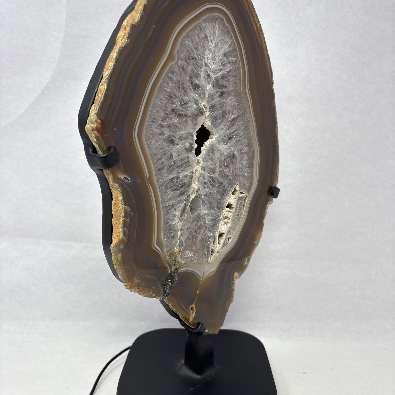 Chocolate Agate Slice with Amethyst Center On Illuminated Table Stand
