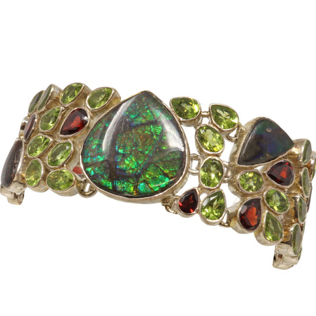 Regular price $1,98500Unit price /UnavailableVery low stock (1 unit)Ammolite Fossil & Peridot Link Bracelet - Pear Center Stone with Garnet - 4 Rows