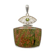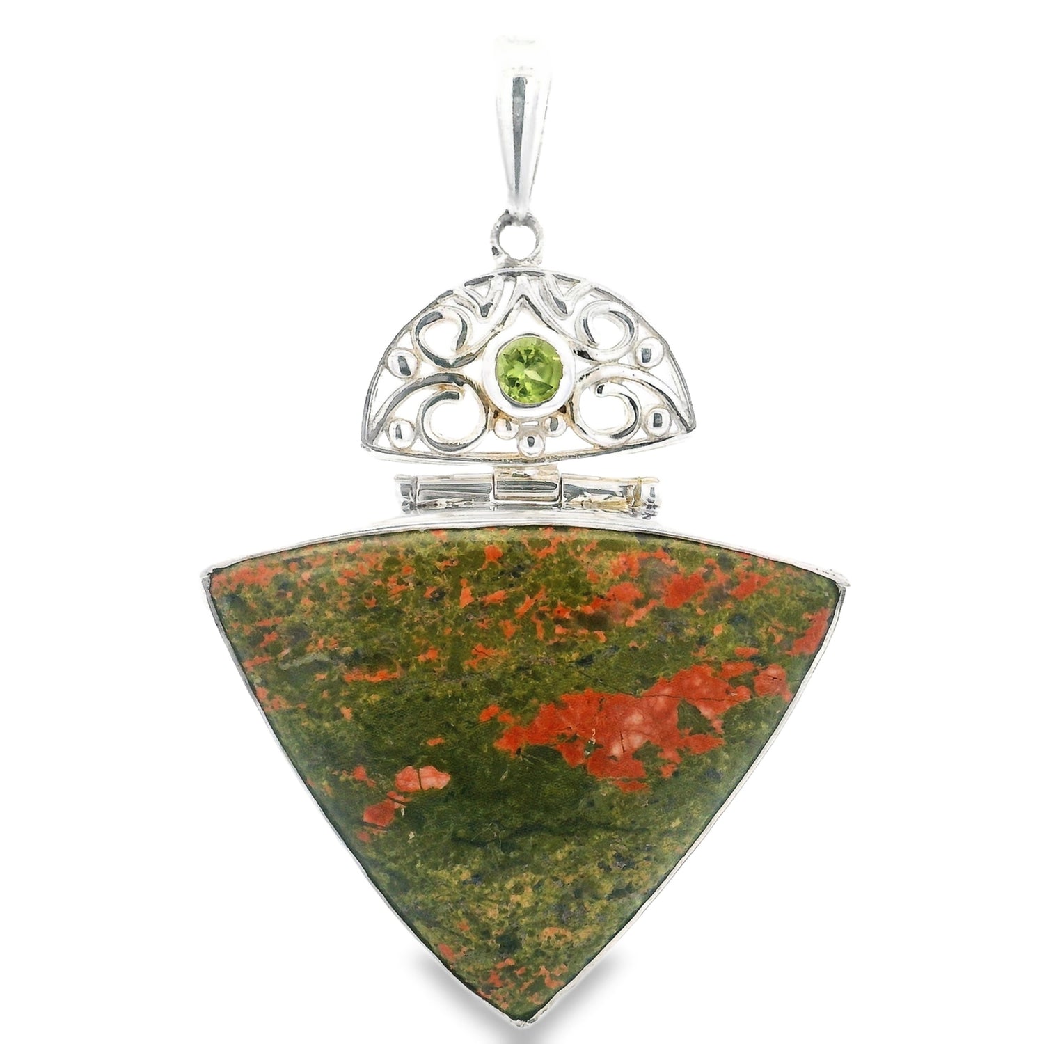 Introducing the stunning Unakite Pendant With Peridot In Filigree. This unique piece of jewelry is crafted with high-quality 925 sterling silver and features a bezel-set Unakite and Peridot gemstones. The eye-catching filigree design adds to its charm. Versatile and stylish, this pendant is perfect for August birthstone lovers or as a unique gift. Add a touch of elegance to your collection with this beautiful pendant.