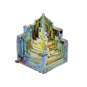 Bismuth Specimen showcases a combination of man-meets-nature artistry with its unique stair-step, spiral crystal formations. This brittle metal, typically silvery-white, transforms into vibrant displays of blue, purple, pink, and gold hues through a delicate oxide layer that refracts light. Its distinctive geometric structure and iridescent colors make it a captivating addition for collectors and enthusiasts seeking both scientific intrigue and aesthetic elegance.