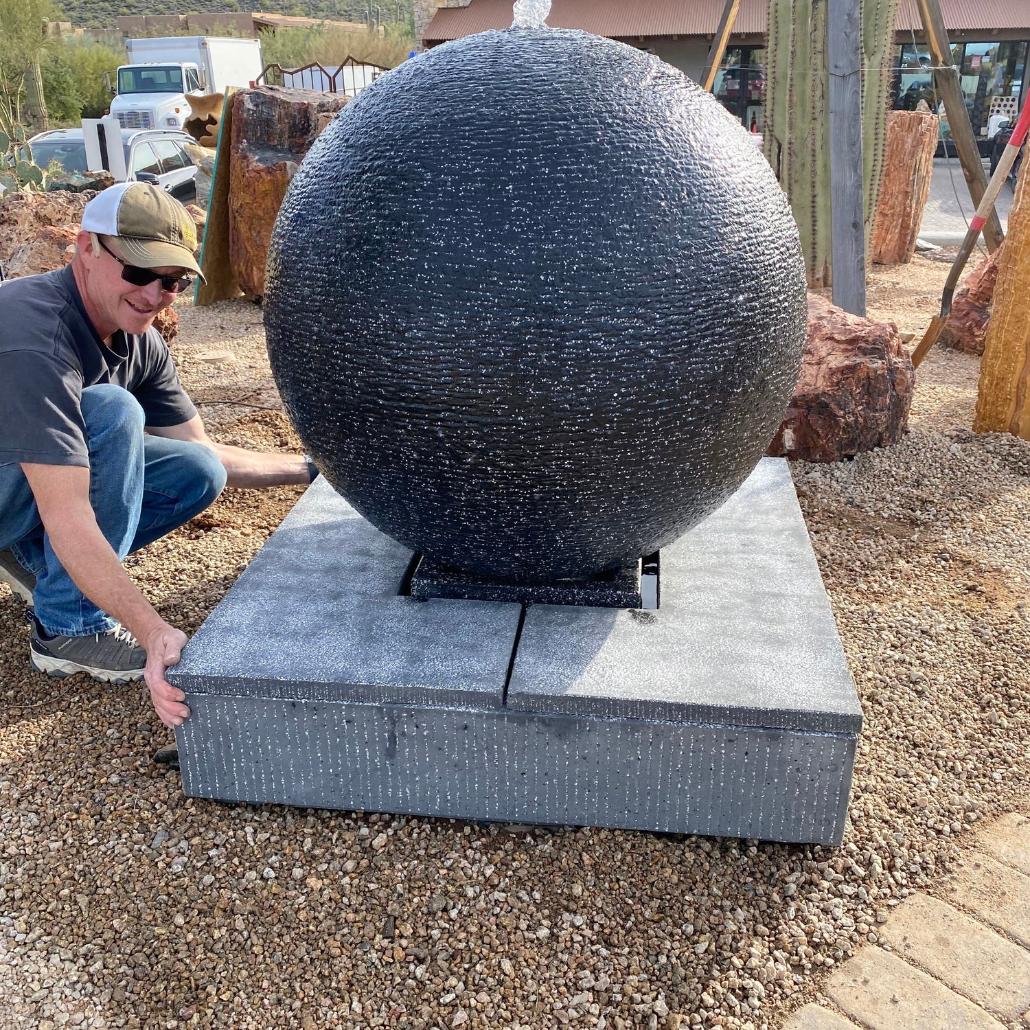 This black casted concrete sphere fountain creates a serene and visually appealing atmosphere in outdoor spaces. Its tranquil water feature is perfect for enhancing the aesthetic appeal of yards, gardens, and patios. Let Rare Earth Gallery’s white-glove service make your fountain dreams come true—simply choose your fountain, tell us where it goes, and we’ll handle the rest, from delivery to installation. IMPORTANT: the purchase price listed is for the FOUNTAIN ONLY and DOES NOT INCLUDE the cost of a pump, parts or installation. Before purchasing a fountain online, we STRONGLY recommend you call us at (480) 575-4360 for a FREE consultation to discuss these additional costs and schedule a pre-site inspection. Also, free shipping does NOT apply to fountains, please call for a quote.