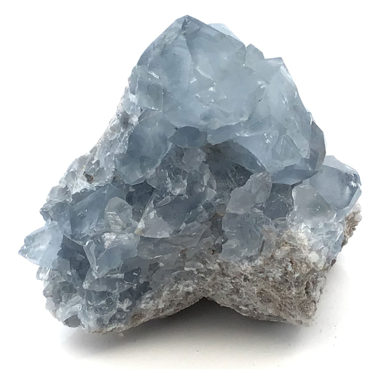 Discover the serene beauty of this exceptional celestine crystal specimen sourced directly from Madagascar's renowned mineral deposits. Featuring delicate sky-blue crystals with natural geometric formations, this piece showcases the mineral's characteristic translucency and subtle striations. Displayed on a custom lucite stand that elevates the specimen for optimal display, it's an ideal centerpiece for collectors, mineral enthusiasts, and those seeking a sophisticated natural accent. Each specimen is unique, with variations in color intensity and crystal structure that highlight nature's artistry. Perfect for curated collections, office displays, or as a meaningful gift for the discerning collector.