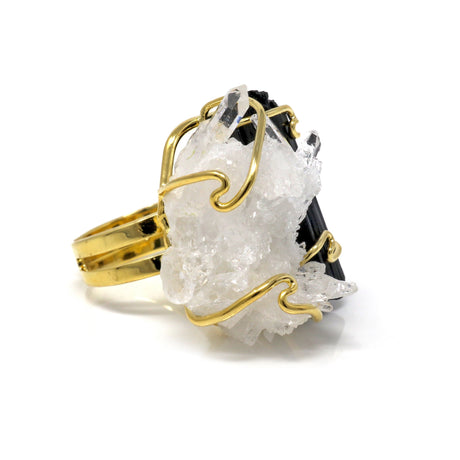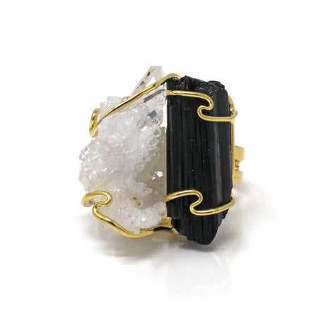 Black Tourmaline & Quartz Crystal Ring - Gold Overlay Brass