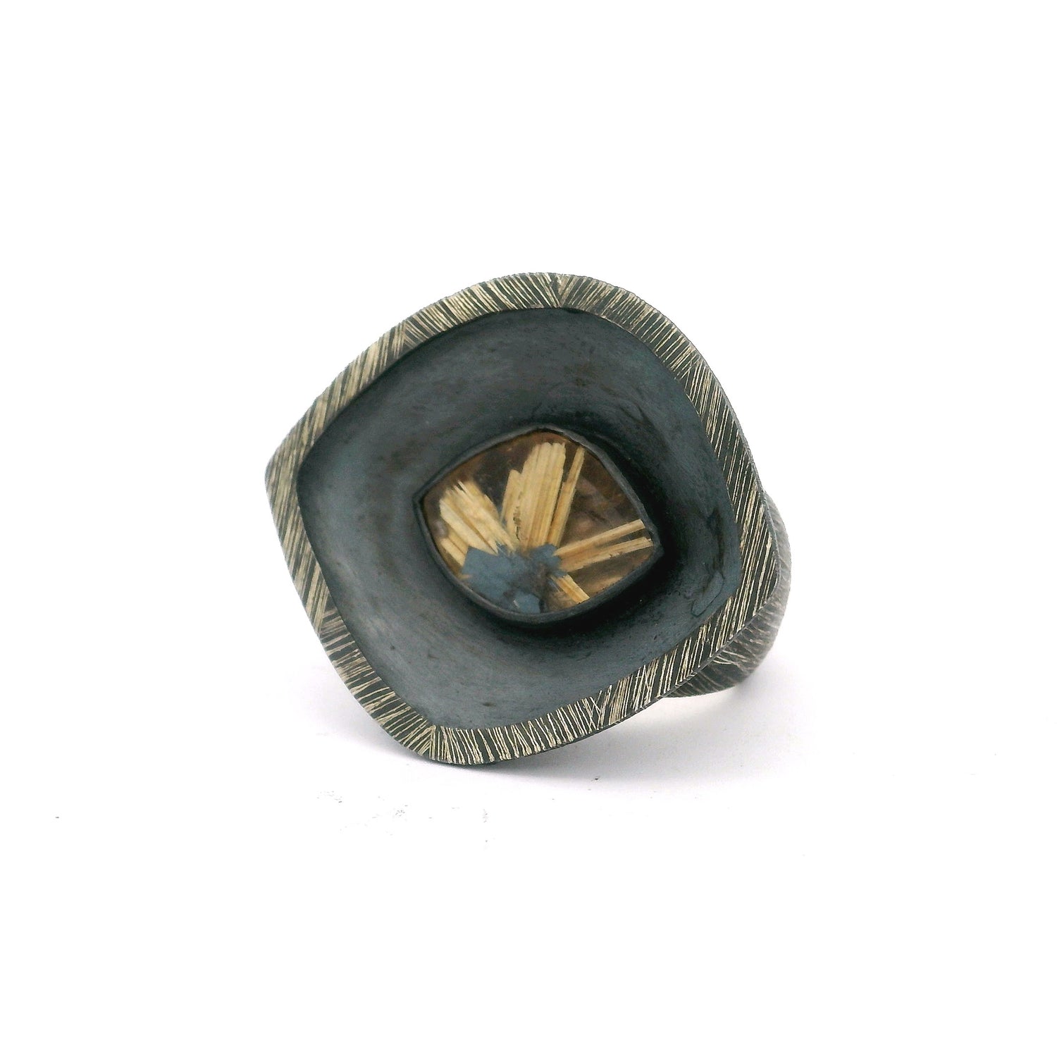 A+ Star Golden Rutile Quartz Ring with Hematite Centers Bezel Set in Oxidized 925 Sterling Silver & Pointed Band - The Cave
