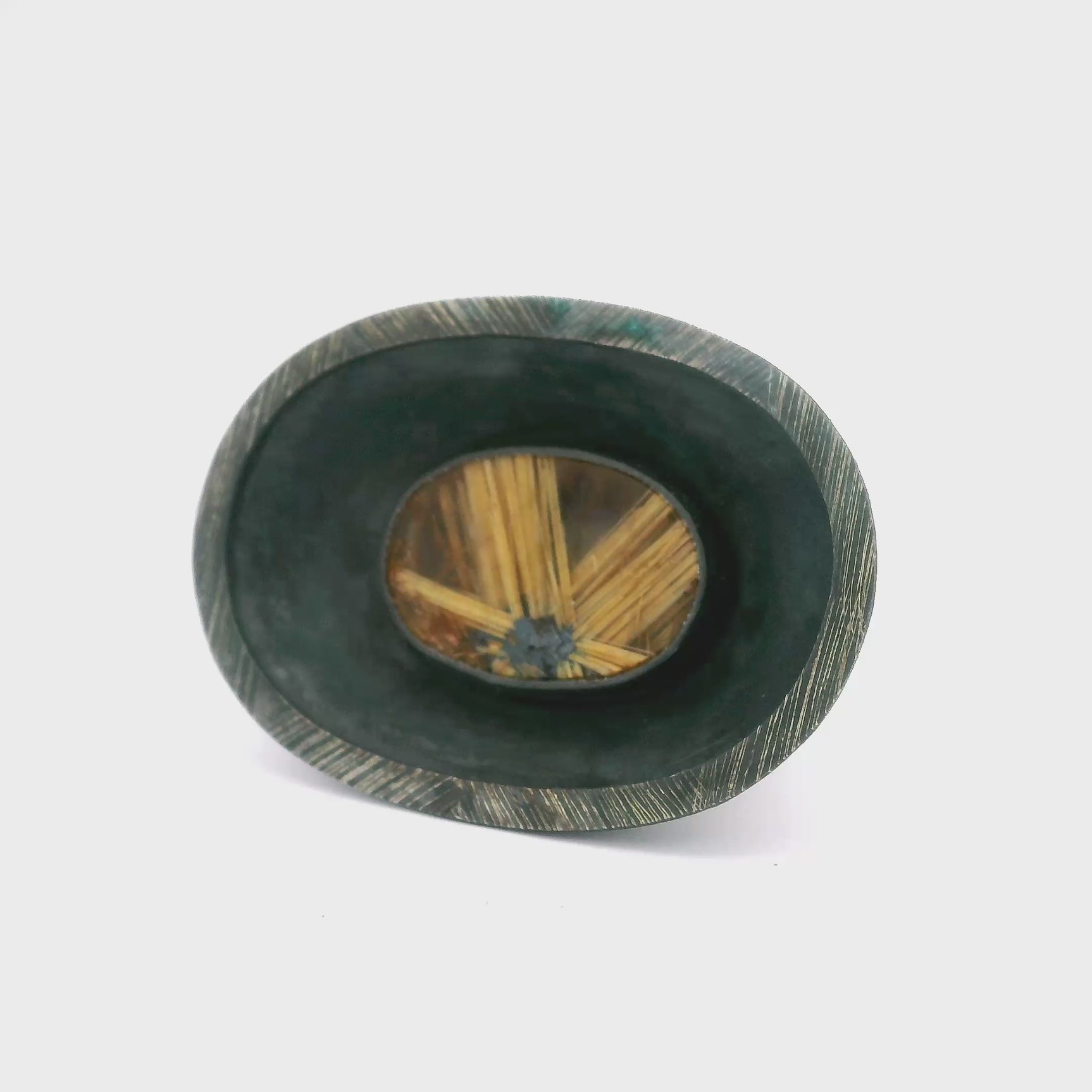 A+ Star Golden Rutile Quartz Ring with Hematite Centers Bezel Set in Oxidized 925 Sterling Silver & Pointed Band - The Cave - Oval is backordered and will ship as soon as it is back in stock.