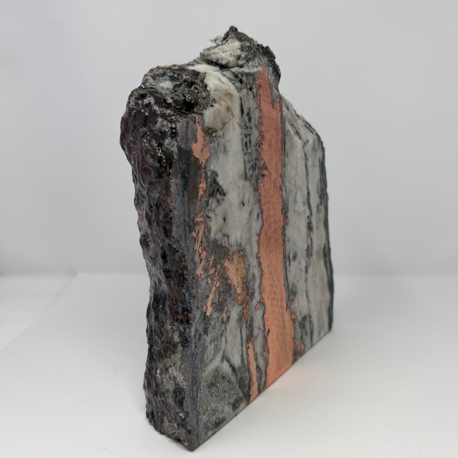 This amazing Michigan native copper specimen showcases the distinctive character of the Upper Peninsula's mineral heritage. This piece features a striking center vein of native copper running through the host rock, creating bold visual contrast and geological interest. The specimen has been expertly cut to highlight the copper's natural metallic luster and color saturation, then mounted on a cork base for stable display. Ideal for collectors, educators, and those drawn to Michigan's rich mining legacy, this one-of-a-kind piece combines scientific appeal with sculptural presence.