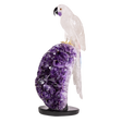 Quartz Macaw with Aquamarine Tail Feather Atop Polished Amethyst Geode