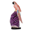 Rose Quartz Macaw with Aquamarine Cheeks on Amethyst Geode with Calcite Imbedded