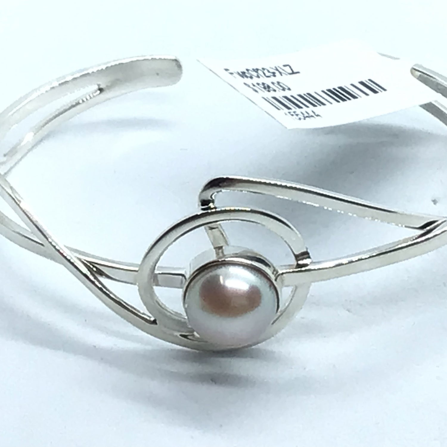 Freshwater Pearl Cuff - Round Pearl with Pink Hue Bezel Set in Center of 925 Sterling Silver Circle Design with Double Cuff is backordered and will ship as soon as it is back in stock.