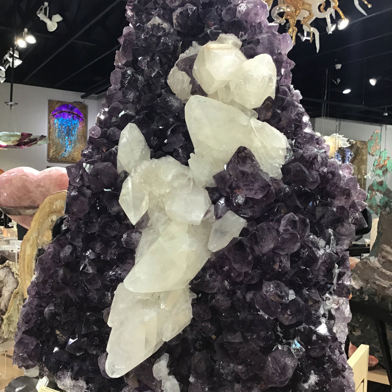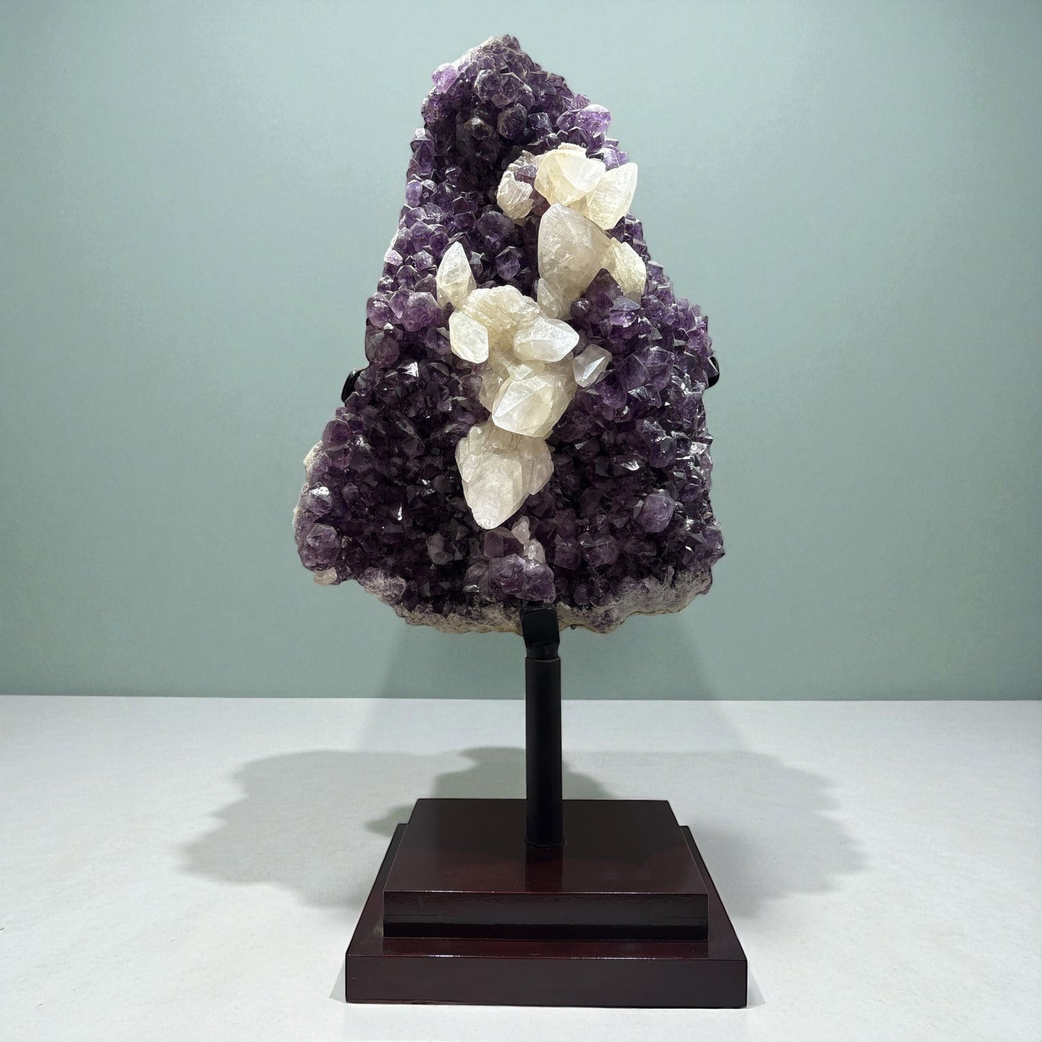 This striking amethyst plaque commands attention with its dramatic centerpiece—a gleaming calcite cluster that catches light from every angle. The sharp, geometric formations of the calcite create a stunning contrast against the rich purple amethyst base, making it a conversation starter for any room. Mounted on a sturdy stand, it's ready to display without fuss. Perfect for crystal enthusiasts, collectors, or anyone seeking a statement piece that blends natural beauty with bold geometry. Each plaque is unique, showcasing nature's artistry in mineral form. A treasure that feels as good as it looks.