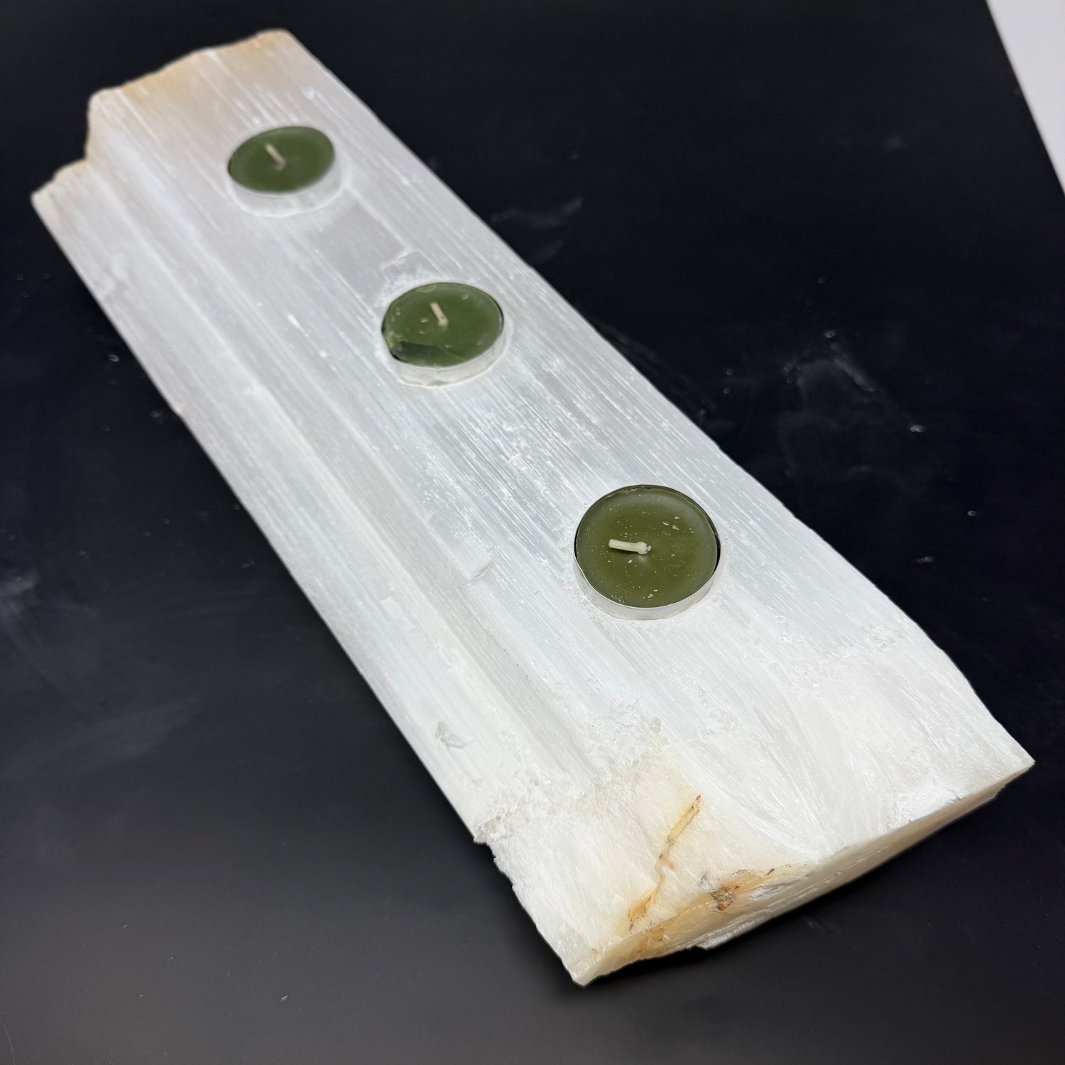 Carved from natural selenite, this elegant log-style candleholder features three recessed tealight wells that showcase the stone's luminous, translucent qualities. The soft glow of burning candles passes through the selenite, creating a warm, ambient light perfect for meditation spaces, bedside tables, or living room displays. Medium sizing balances visual presence with practical placement on shelves and surfaces. Each piece is naturally unique—variations in color, clarity, and veining are inherent to the material and add to its authentic appeal. Selenite is prized for its calming energy and light-diffusing properties. This functional art piece serves as both a decorative accent and a mindful lighting solution for any room.