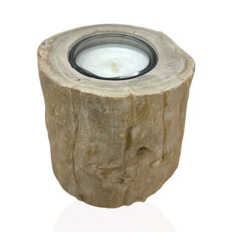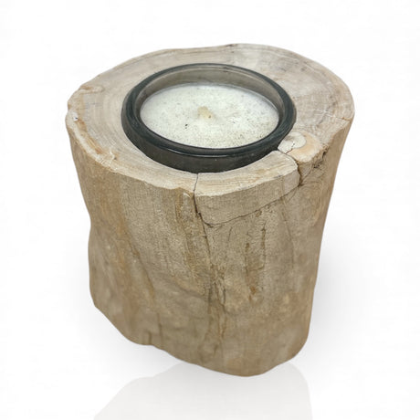 Madagascar Petrified Wood Stump Candle Holder - Single Glass Tealight with Beige Smooth Bark