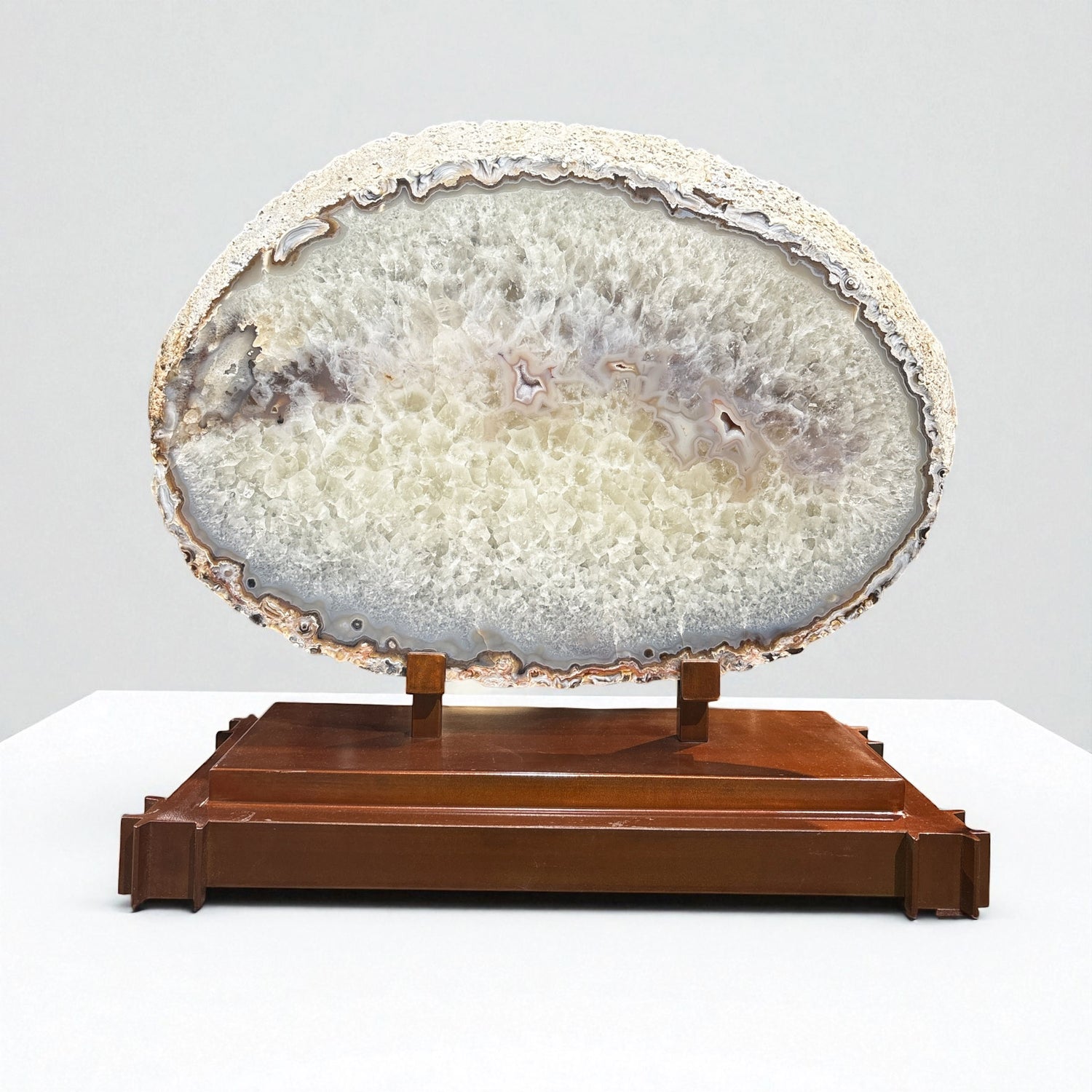 This agate slice with pink tone druze vugs on a custom stand is a statement piece for any collection. Its 2-step copper patina and steel stand make it a unique addition to your crystal collection. Perfect for home decor, this rare find captures attention and adds a touch of elegance to any room. Position it as a centerpiece or add to a collection of crystals and accessories for a unique display.