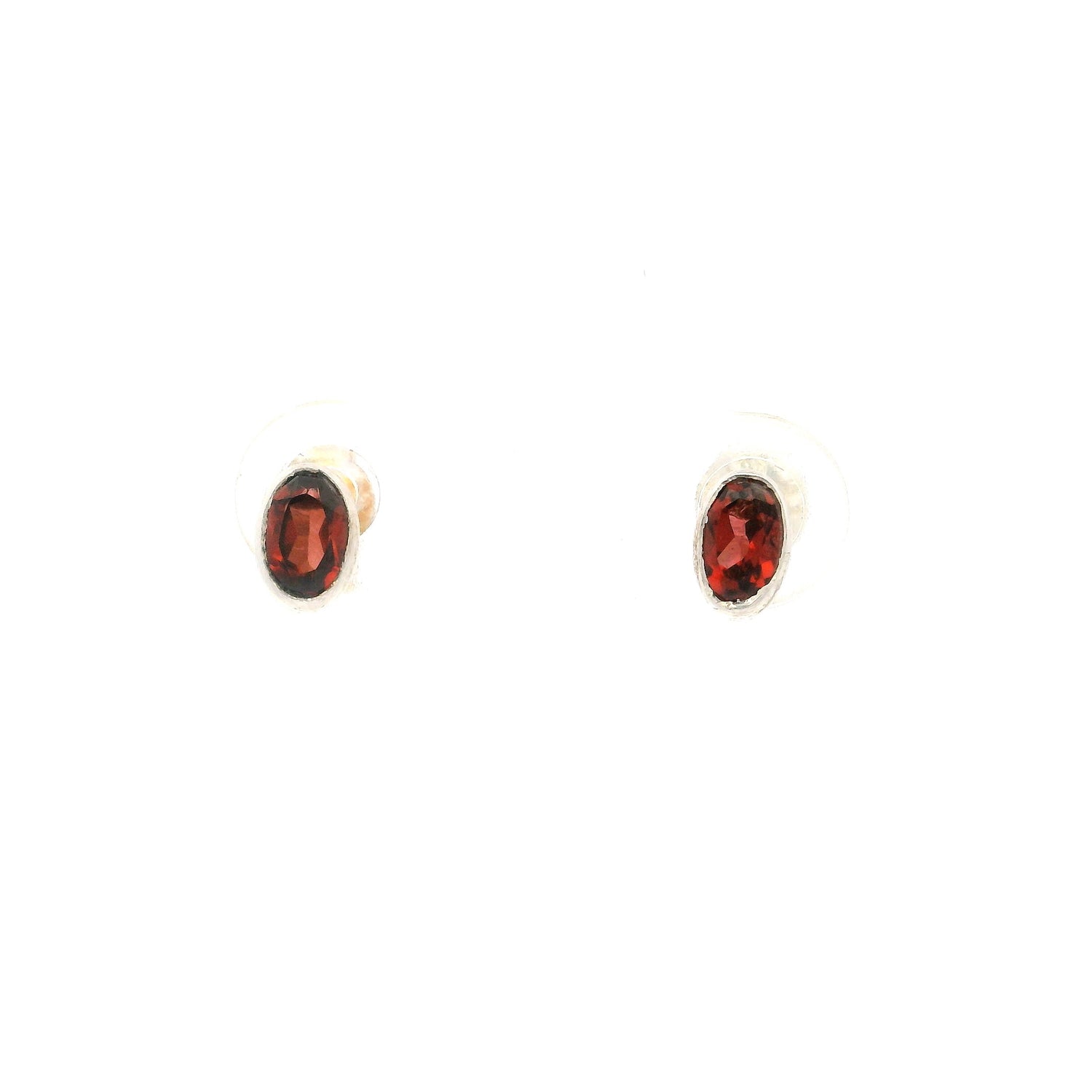 Faceted Garnet Stud Earrings - Oval With Simple Silver Bezel
