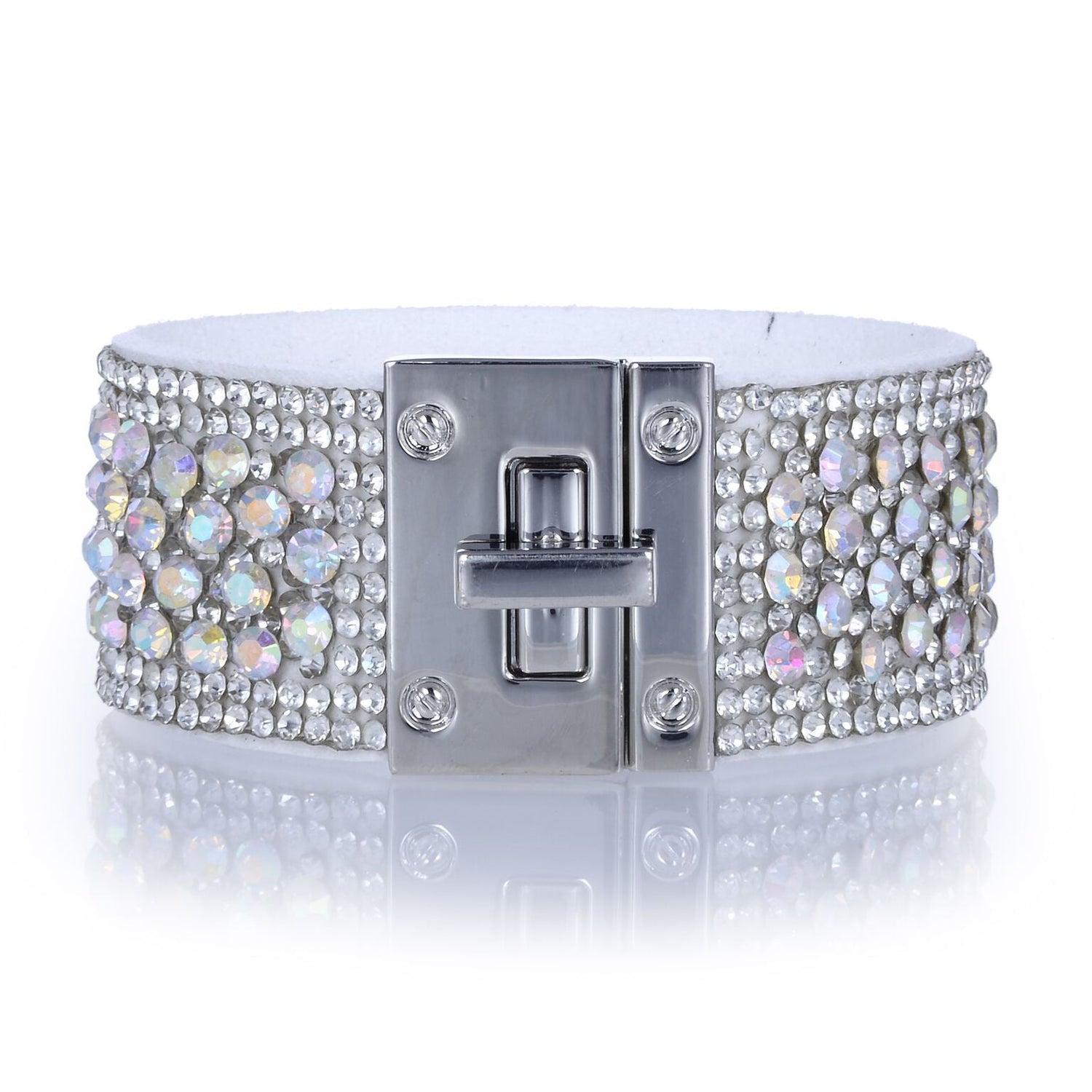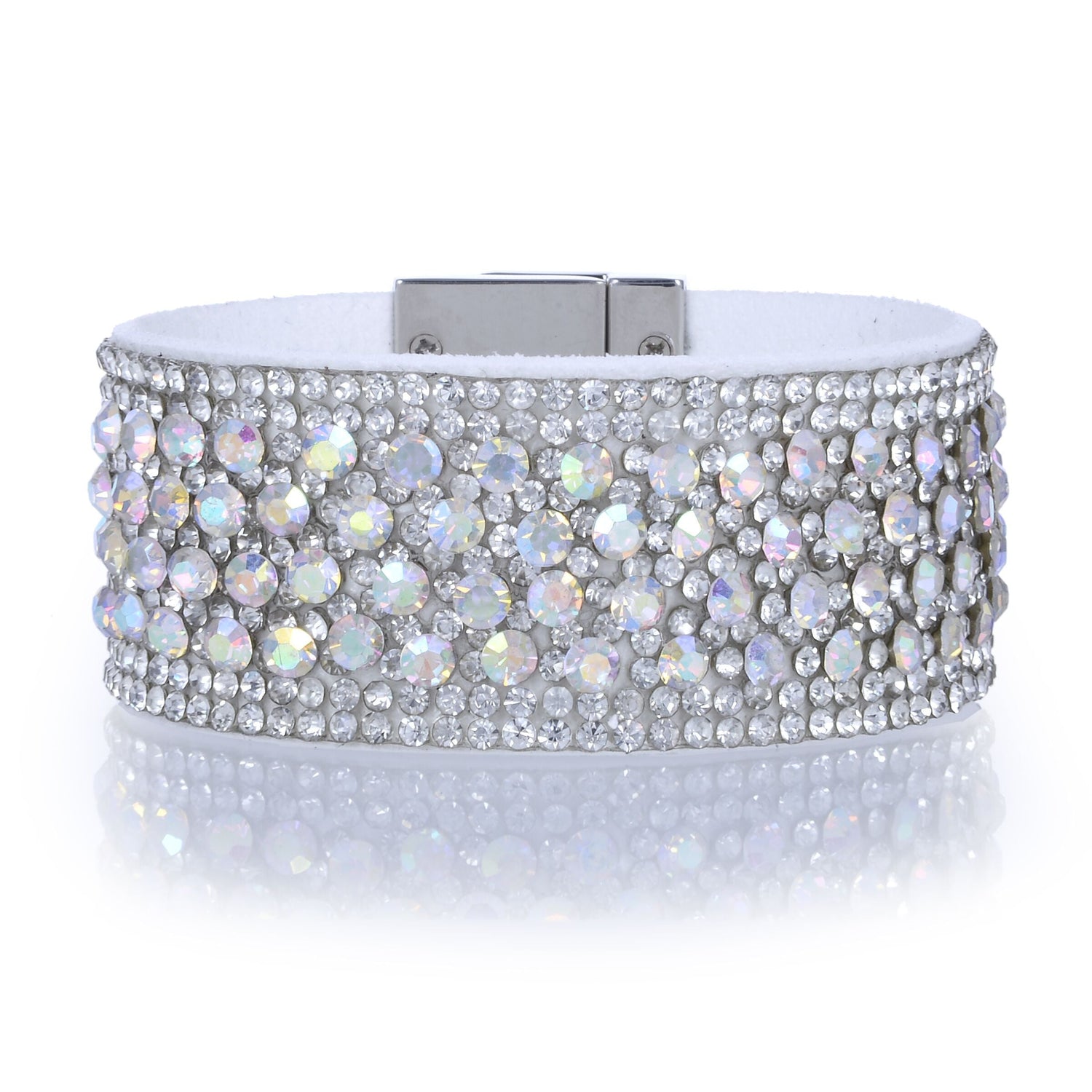 Introducing the stunning Narrow Crystal Wrap Bracelet. Crafted from black iridescent leather and genuine Czs, this bracelet features a unique magnetic closure for comfort and convenience. Its bright color and timeless design make it a great gift for any woman. Perfect for everyday wear, this bracelet effortlessly complements any outfit. Shop now for the perfect accessory that adds a touch of elegance to any occasion.