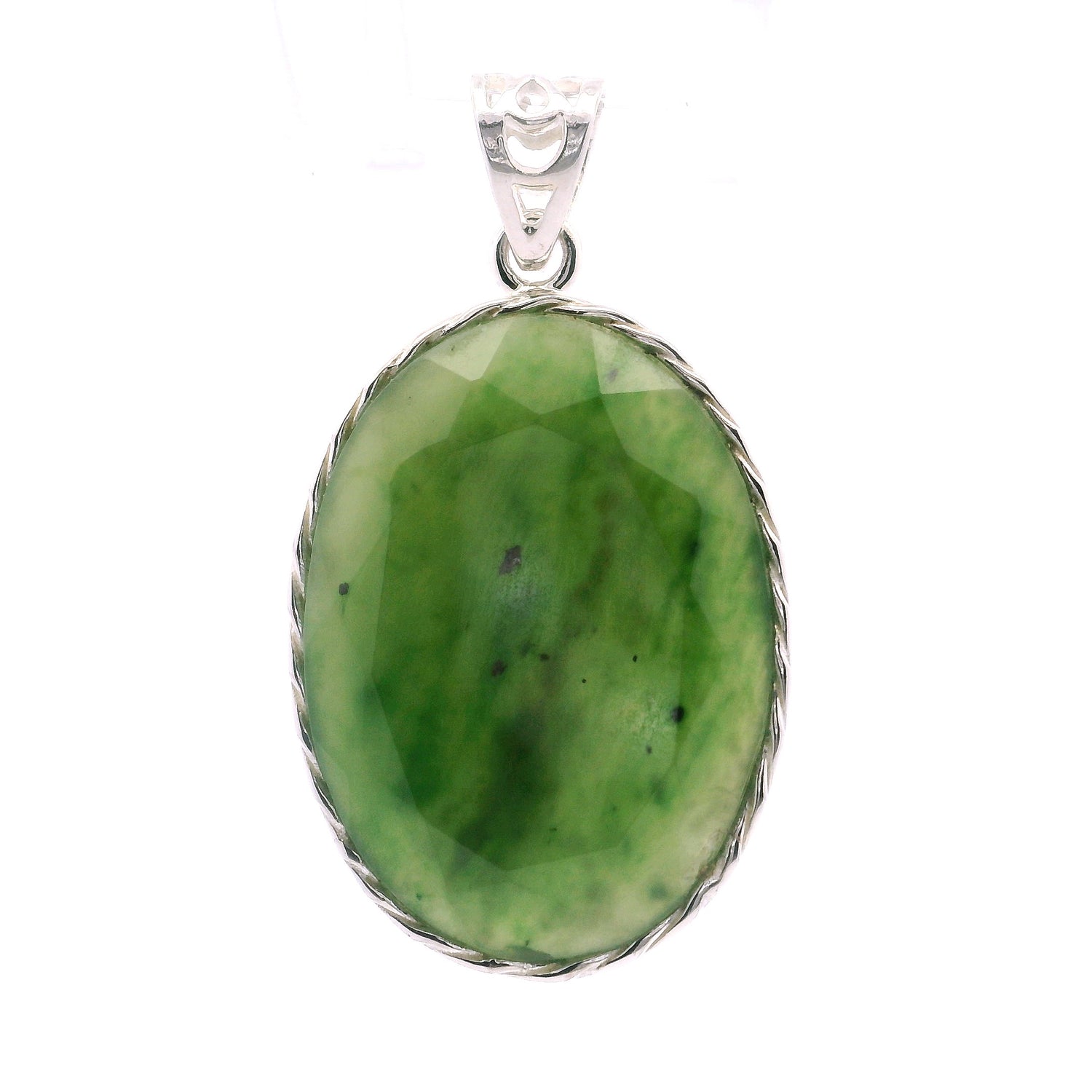 Faceted Nephrite Jade Oval Pendant in Ornate Bezel Setting with Fancy Bail in 925 Sterling Silver