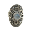 This striking ring features a luminous round rainbow moonstone as its centerpiece, showcasing the stone's signature adularescence and soft play of light. The moonstone is set within an ornate flower-inspired saddle band design that cradles the stone with botanical elegance. The saddle band construction provides secure support while allowing the stone's natural glow to radiate from all angles. Rainbow moonstone is prized for its ethereal quality and gentle iridescent shimmer that shifts with movement and