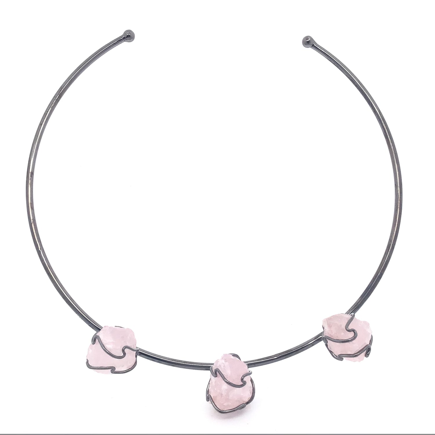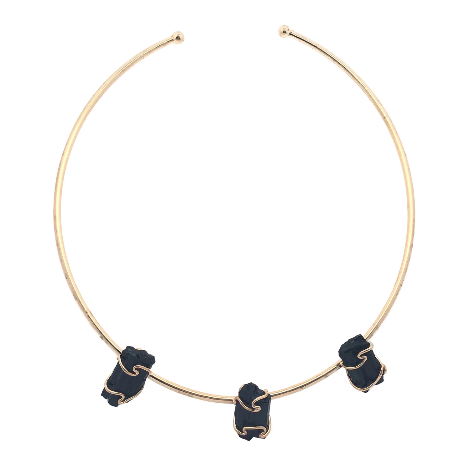 This artisanal collar necklace showcases three raw, unpolished gemstones meticulously wire-wrapped in a sculptural design. Each stone is hand-secured with plated brass wire, creating an organic, textured aesthetic that celebrates the natural beauty of the minerals. The collar silhouette sits elegantly at the neckline, making a bold statement piece for collectors and gem enthusiasts. Perfect for layering or wearing solo, this one-of-a-kind design bridges fine jewelry and mineral art. Ideal for those who appreciate raw authenticity and craftsmanship over conventional polish.