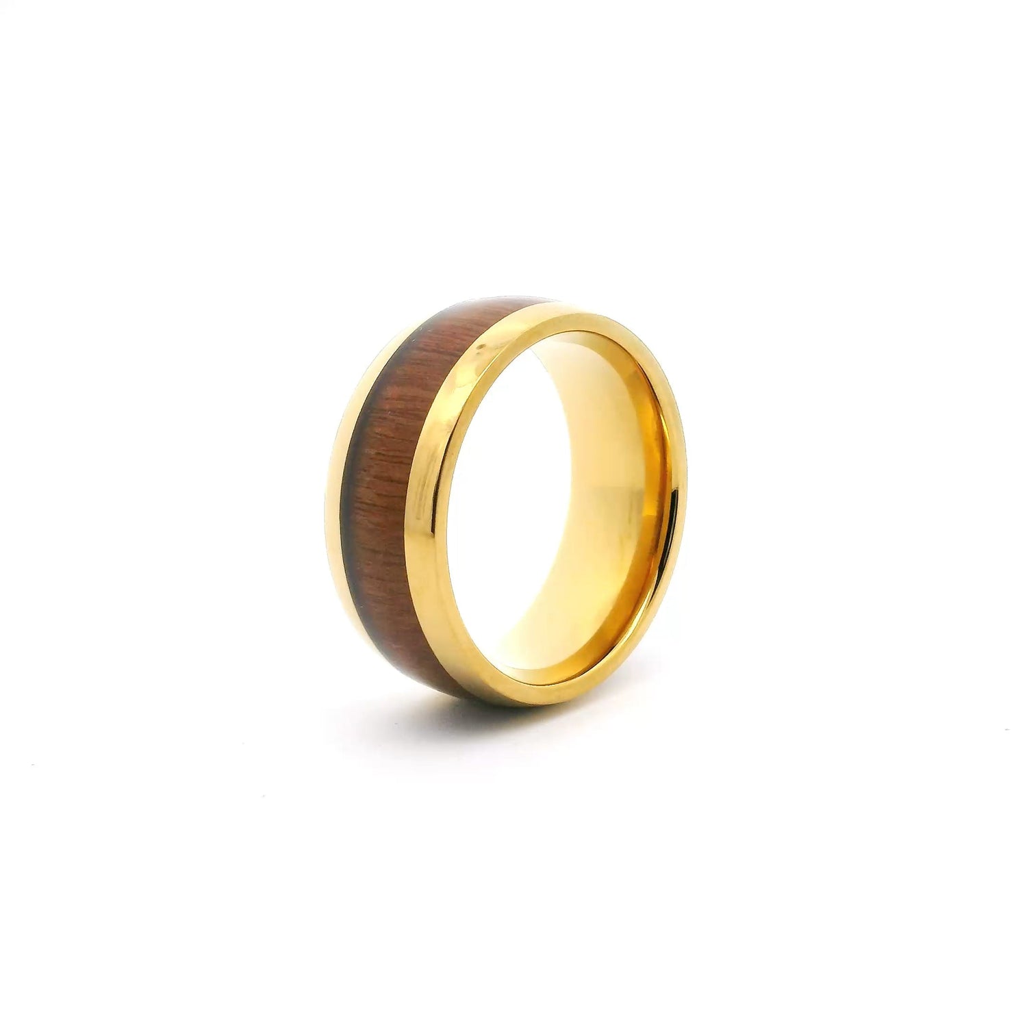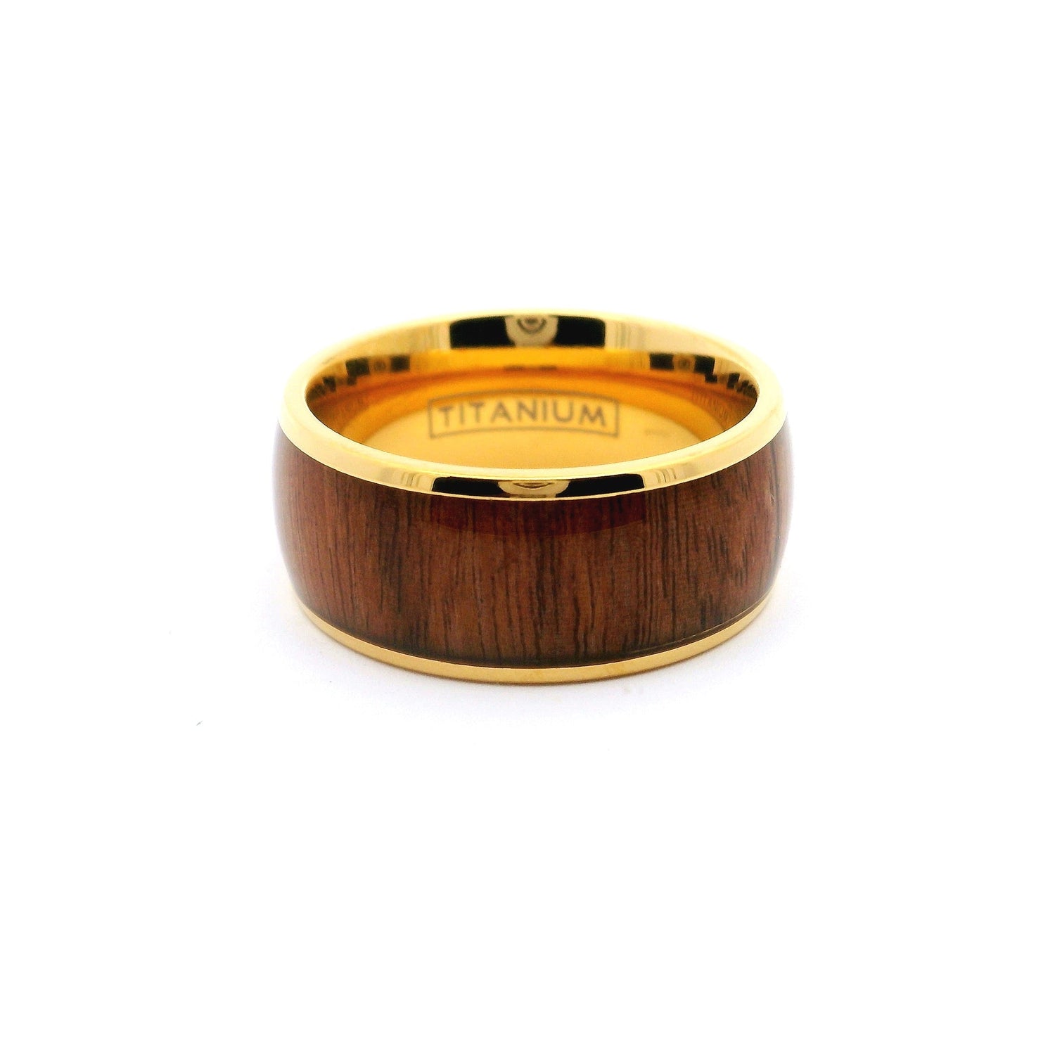 Titanium Ring 9mm Yellow Gold IP Plated with Hawaiian Koa Wood Inlay s8