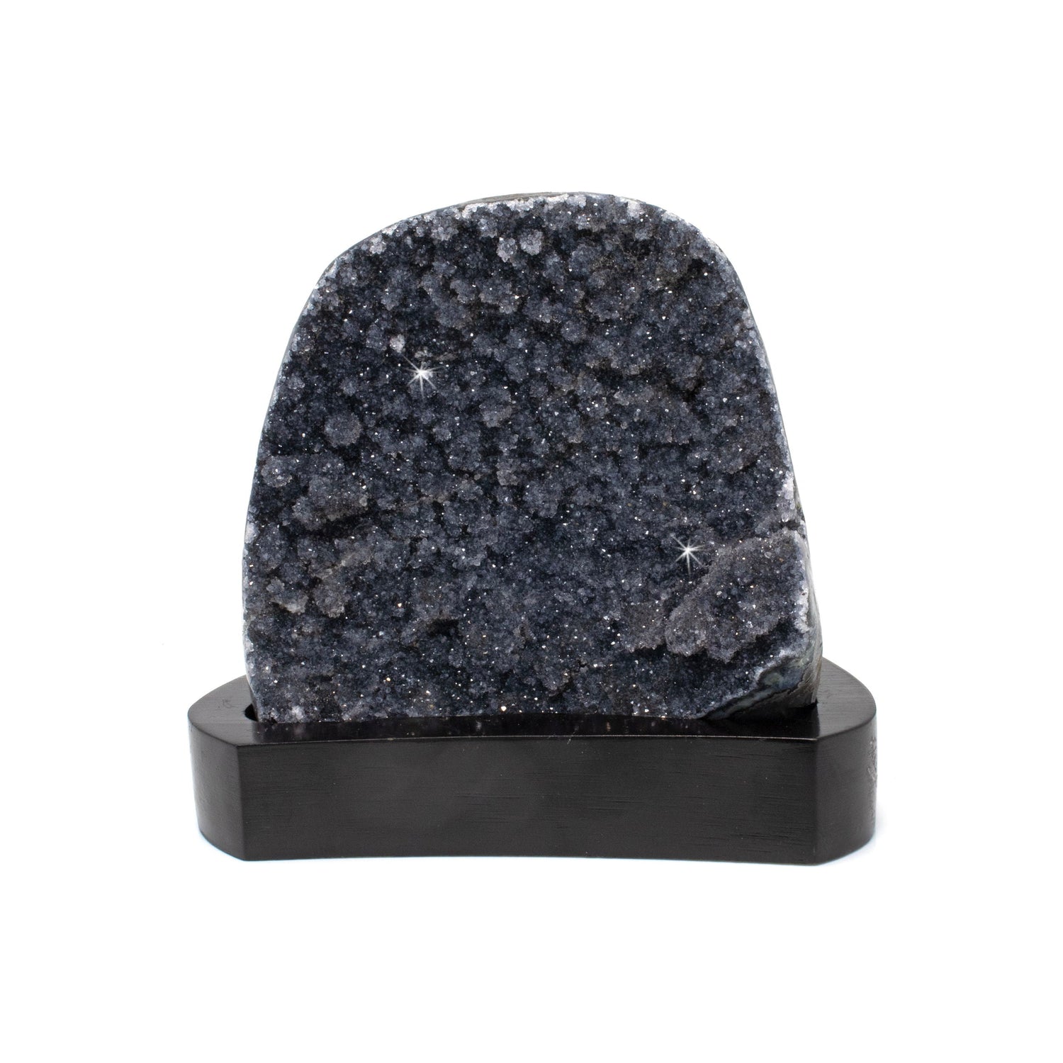 Introducing the Amethyst Druze Geode: a unique and elegant home and office accessory. Made of sparkling druzy quartz crystals, set on a sturdy wood base. This dark amethyst piece is a timeless addition to any mineral collection. It highlights the beauty and mystery of Earth's hidden treasures. Perfect as a gift for anyone, it's sure to be a conversation starter.