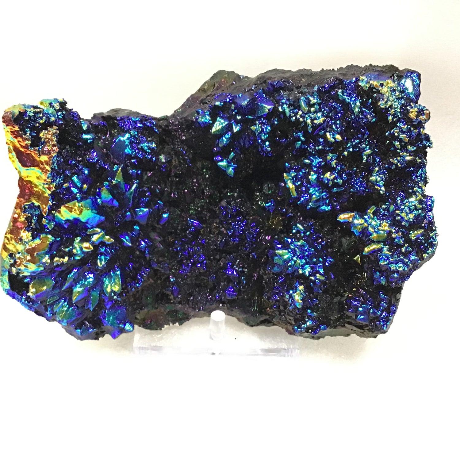 Elevate your space with this exquisite Black Titanium Coated Moroccan Geode Wedge, elegantly displayed on a sleek Lucite stand. The metallic sheen of the titanium coating enhances the natural beauty of the geode's intricate formations, while the transparent stand offers a modern, floating effect. This piece combines geological wonder with refined design, making it a captivating centerpiece that adds depth and sophistication to any environment.