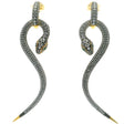 Turn heads with the Nano Stone Dangle Earrings, a mesmerizing fusion of elegance and intrigue. Each two-piece earring showcases a sinuous snake motif, beautifully crafted in gold vermeil over 925 sterling silver for a lustrous, lasting shine. The serpent’s body is adorned with glistening quartz crystals, accentuating its fluid movement, while bright green eyes add a hint of mystical allure. Lightweight and exquisitely detailed, these long dangle earrings are perfect for adding a statement finish to your ensemble—whether for evening glamour or everyday enchantment.