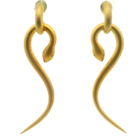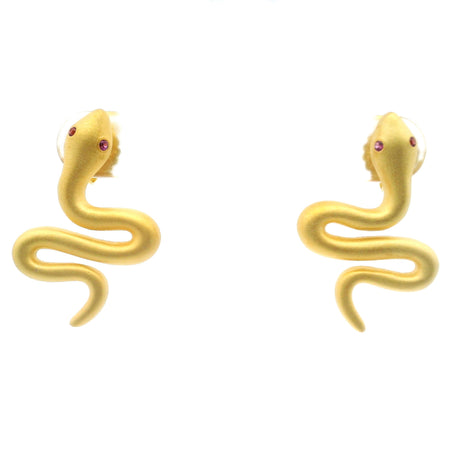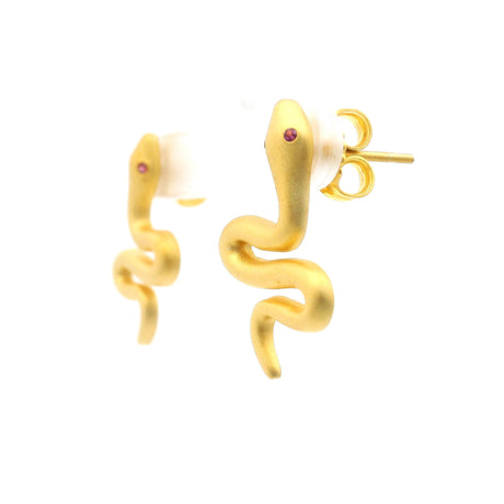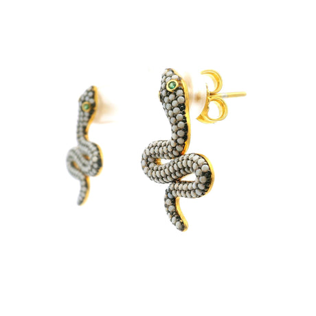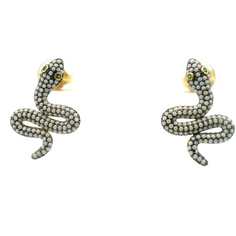 Nano Stone Stud Earrings - White Snake with Green Eyes in Gold Vermeil over 925 Sterling Silver