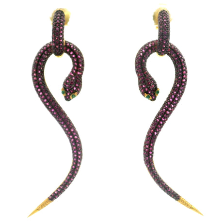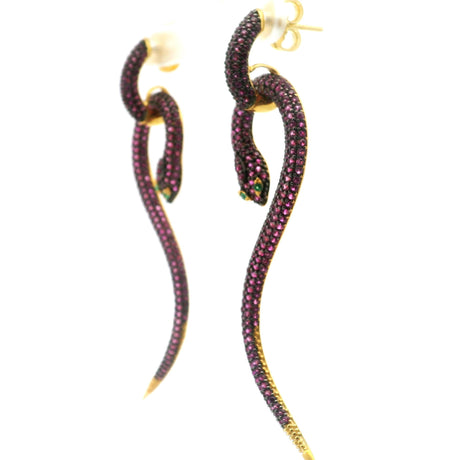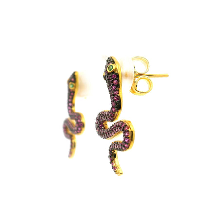 Nano Stone Stud Earrings - Pink Snake with Green Eyes in Gold Vermeil over 925 Sterling Silver
