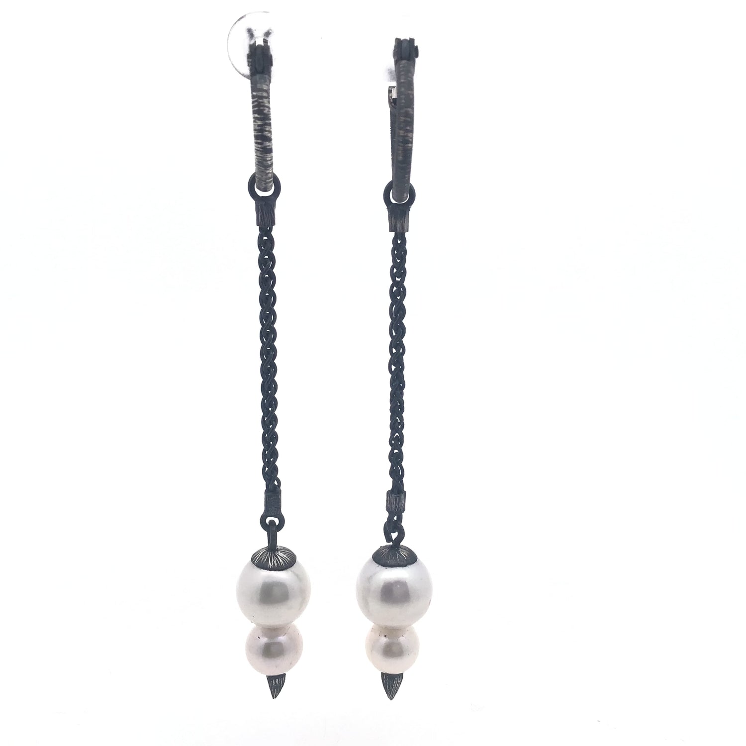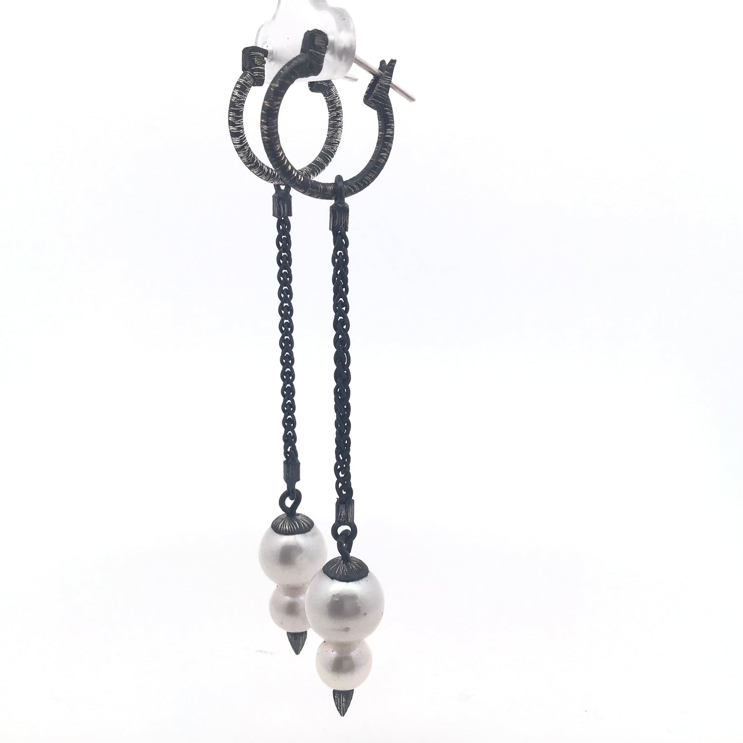 Freshwater pearl dangle earrings featuring lustrous double pearls suspended from oxidized 925 sterling silver hoops adorned with delicate spikes. The darkened silver creates striking contrast against the soft iridescence of the freshwater pearls, while the spike detailing adds contemporary edge to a timeless design. Each pair is handcrafted with attention to quality materials and artisanal finish. Perfect for layering or wearing as a statement piece, these earrings blend organic elegance with modern sculptural elements. Ideal for collectors seeking distinctive, one-of-a-kind jewelry with premium craftsmanship.
