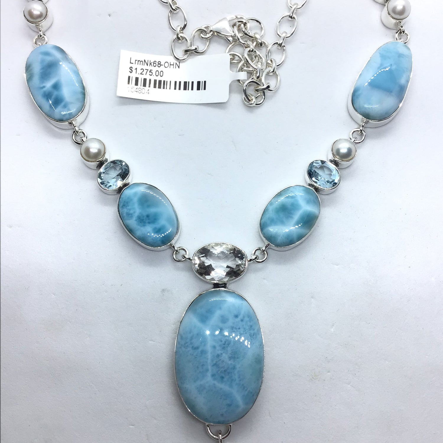 Larimar Necklace - 5 Oval Cabochons with Freshwater Pearls with Faceted Quartz & Blue Topaz - Set in 925 Sterling Silver Bezels is backordered and will ship as soon as it is back in stock.