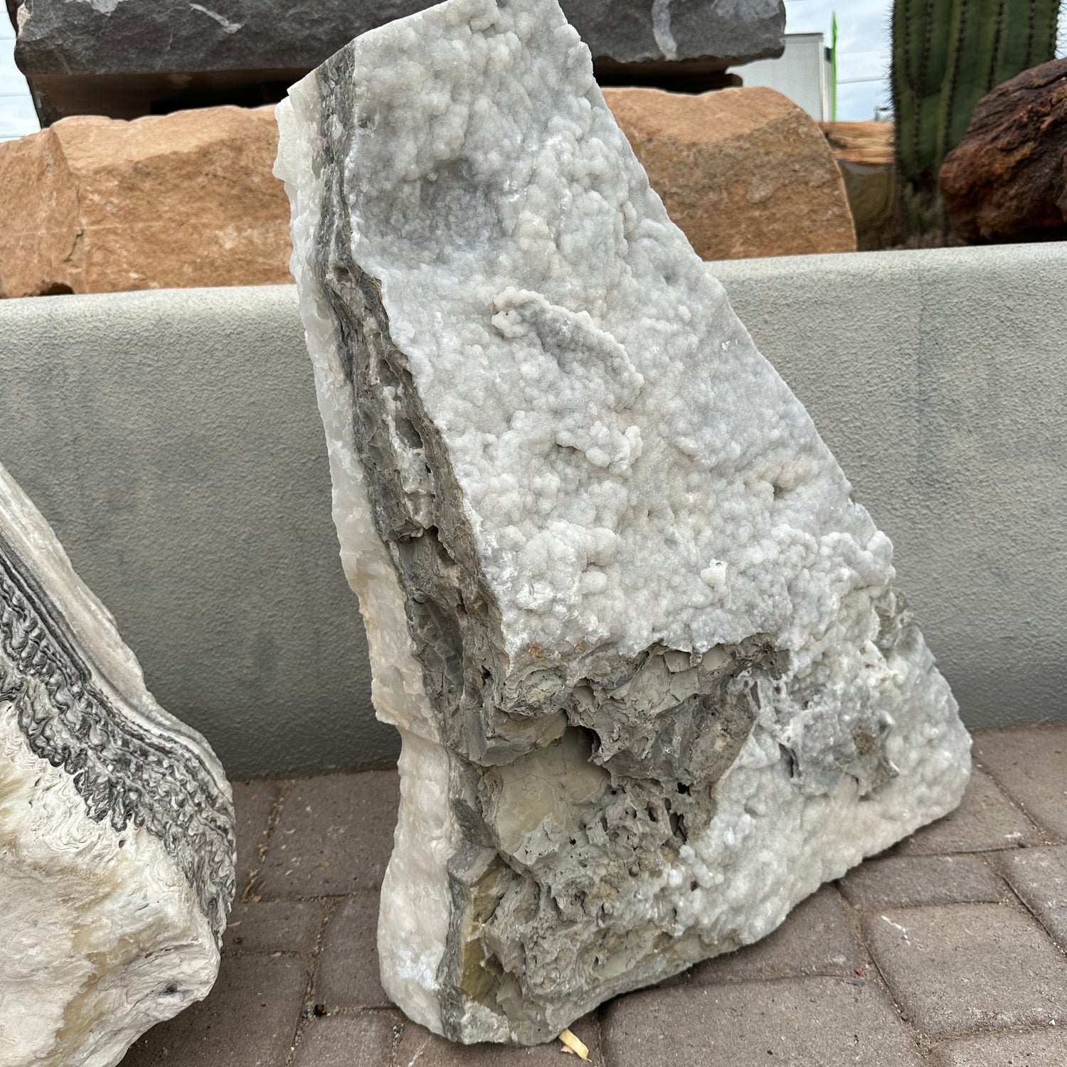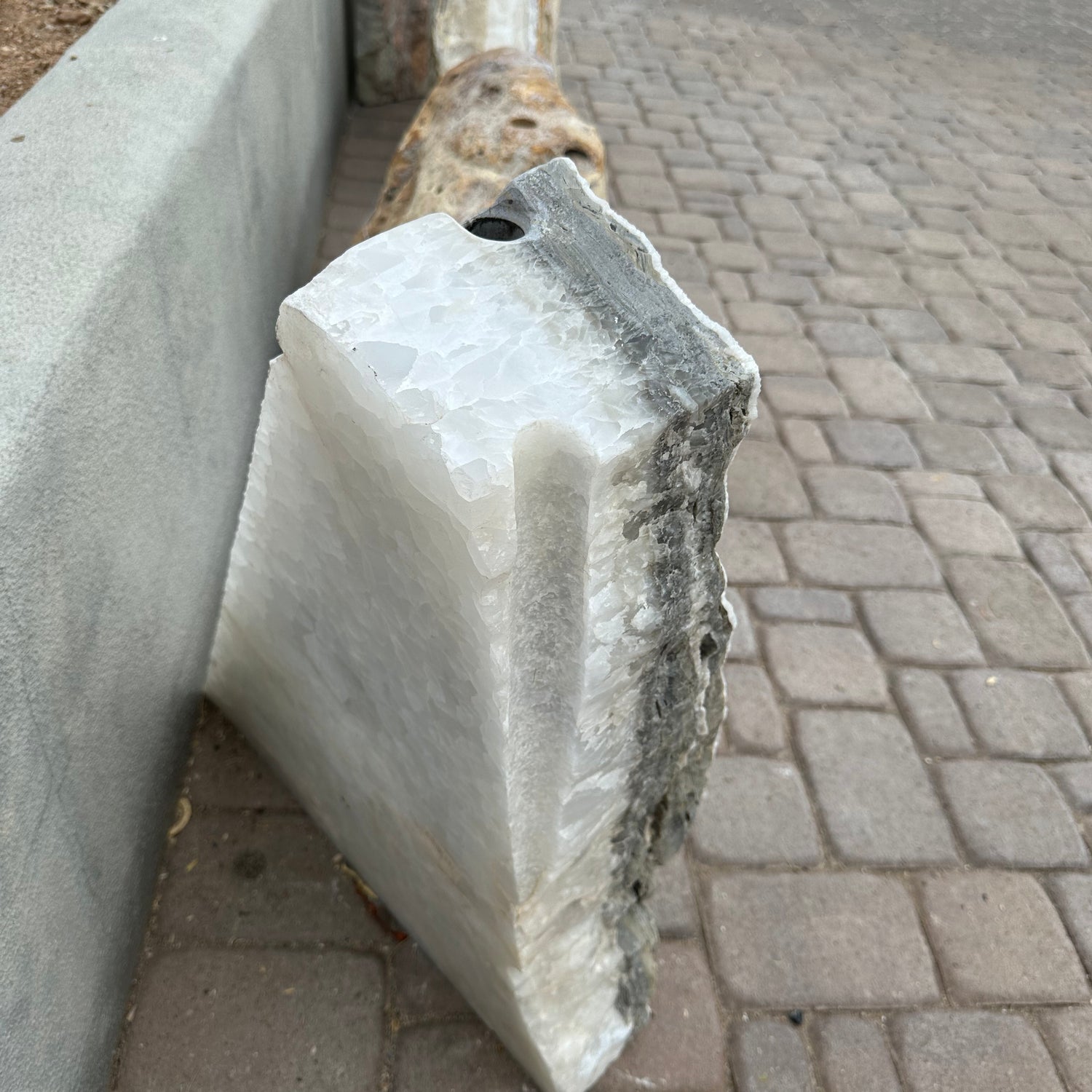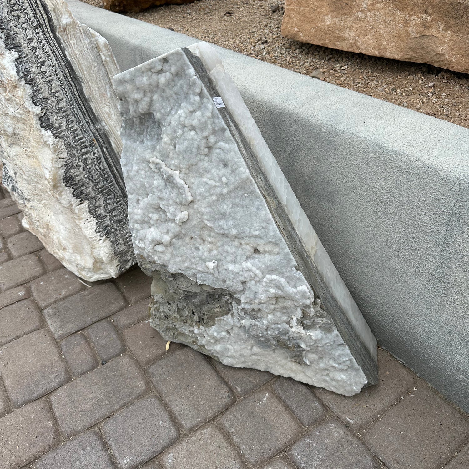 This Gray Travertine & Ice White Onyx Fountain with a Triangular Shape and Druze Inclusions is a premium natural stone outdoor water feature designed for backyards, courtyards, patios, and garden landscapes. Its a blend of gray travertine and ice white onyx with sparkling druze accents and angular carved lines that create a contemporary sculptural feel make it a striking focal point for any tranquil outdoor setting. The fountain’s flow encourages relaxation with soothing sound and movement, helping your outdoor space feel calm and inviting. Create a peaceful, eye-catching focal point for your desert landscape. Let Rare Earth Gallery’s white-glove service make your fountain dreams come true—simply choose your fountain, tell us where it goes, and we’ll handle the rest, from delivery to installation. IMPORTANT: the purchase price listed is for the FOUNTAIN ONLY and DOES NOT INCLUDE the cost of a basin, pump, parts or installation. Before purchasing a fountain online, we STRONGLY recommend you call us at (480) 575-4360 for a FREE consultation to discuss these additional costs and schedule a pre-site inspection. Also, free shipping does NOT apply to fountains, please call for a quote.