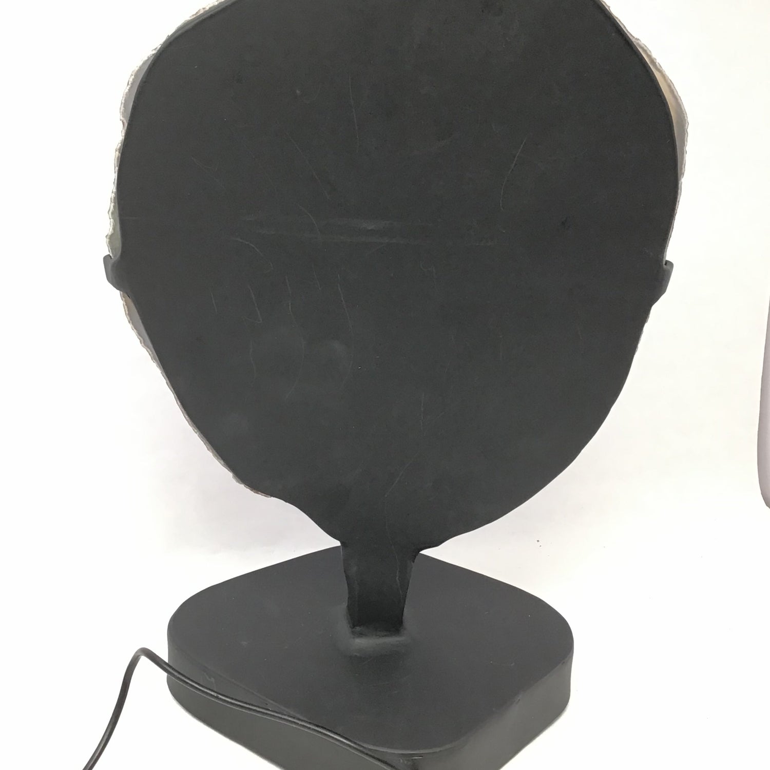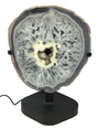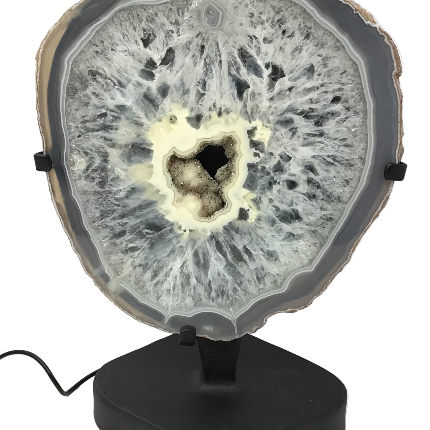 Gray Blue Agate Druze Slice with Cream Agate Center On Illuminated Table Stand - Black