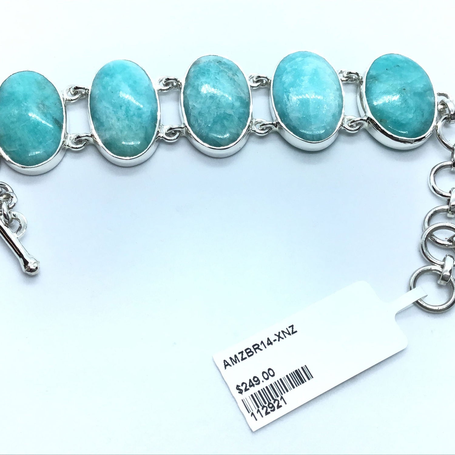 Amazonite Link Bracelet - 5 Oval Cabochons With Simple Silver Bezels & Double Hinge Links
