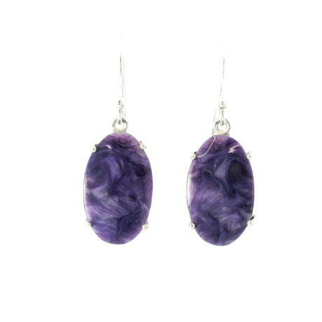 Regular price $11900Unit price /UnavailableVery low stock (1 unit)Charoite Oval Flat Dangle Earrings Prong Set with Distinctive Patterns
