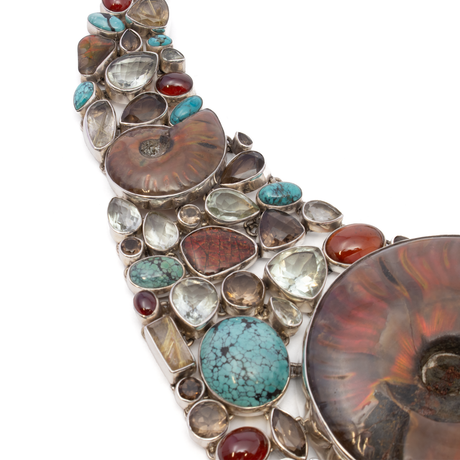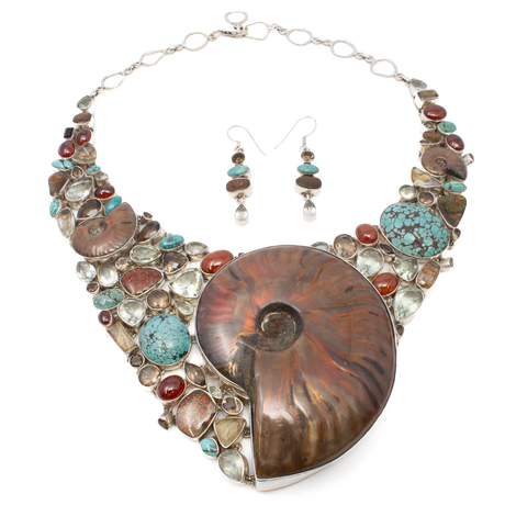 Regular price $11900Unit price /UnavailableVery low stock (1 unit) Opalized Ammonite Fossil Necklace & Dangle Earrings Set With Multi Gemstone Matrix - Large Ammonite