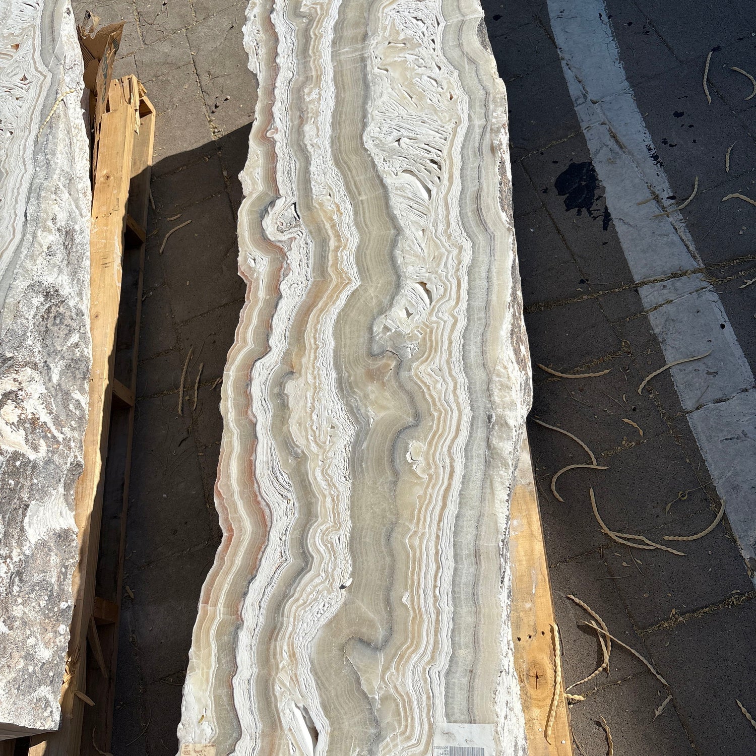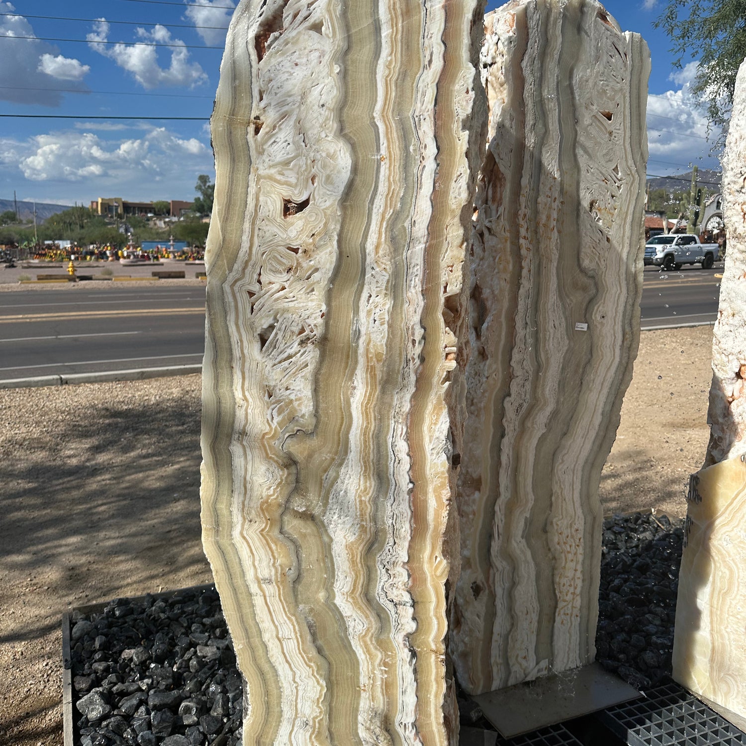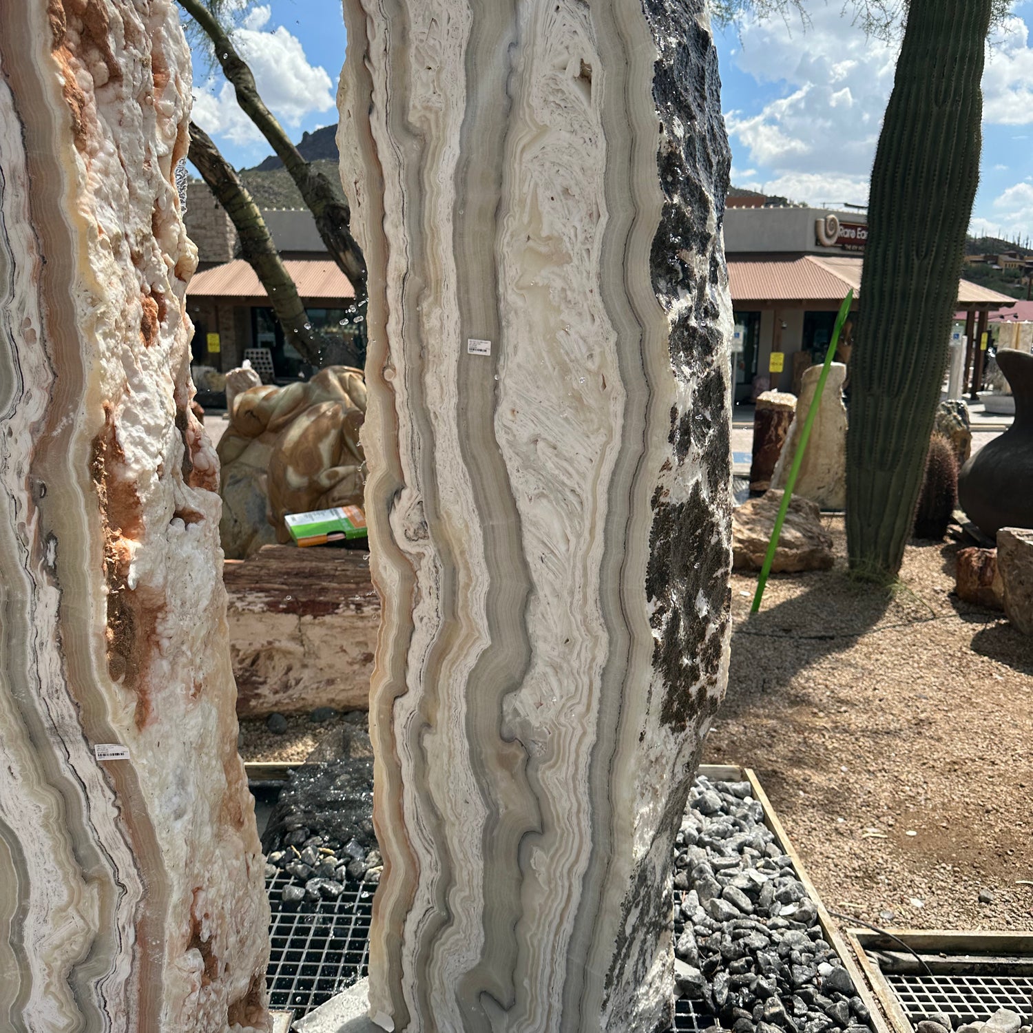 This Zebra Fossil Onyx Pillar Fountain with 1 Hole & 2 Cut Sides is a premium natural stone outdoor water feature designed for backyards, courtyards, patios, and garden landscapes. Its fossil-rich onyx layers and organic natural banding and a vertical pillar form that adds architectural height and elegance make it a striking focal point for any tranquil outdoor setting. The fountain’s flow encourages relaxation with soothing sound and movement, helping your outdoor space feel calm and inviting. Create a peaceful, eye-catching focal point for your desert landscape. Let Rare Earth Gallery’s white-glove service make your fountain dreams come true—simply choose your fountain, tell us where it goes, and we’ll handle the rest, from delivery to installation. IMPORTANT: the purchase price listed is for the FOUNTAIN ONLY and DOES NOT INCLUDE the cost of a basin, pump, parts or installation. Before purchasing a fountain online, we STRONGLY recommend you call us at (480) 575-4360 for a FREE consultation to discuss these additional costs and schedule a pre-site inspection. Also, free shipping does NOT apply to fountains, please call for a quote.