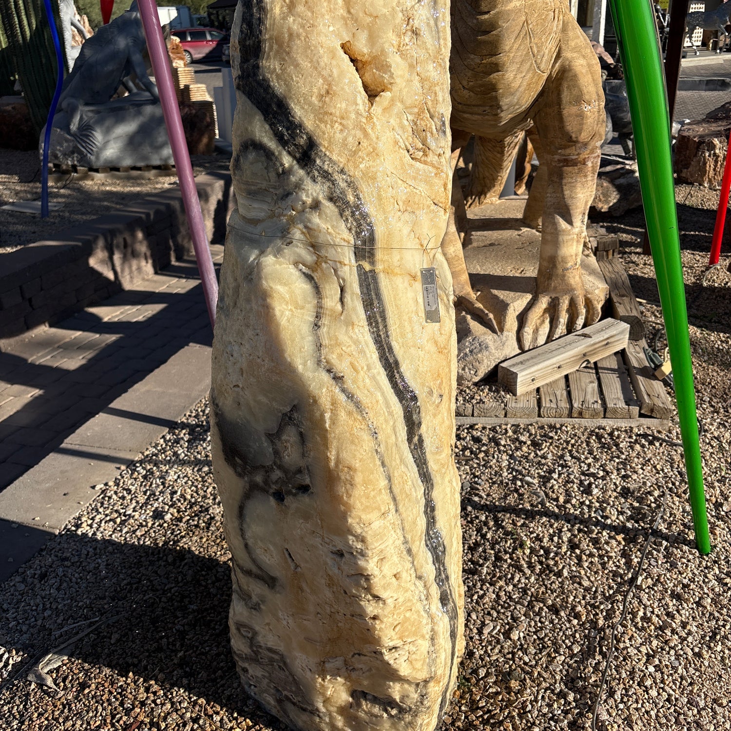 Elevate your outdoor space with the striking Zebra Onyx Pinnacle Column Fountain. Hand-carved from authentic Zebra Onyx, this bold column features dramatic bands of black, white, and gold that shimmer in sunlight, revealing the stone’s natural elegance. Its tapered silhouette and commanding height create a powerful focal point for gardens, patios, or entryways. Precision-drilled for seamless water flow (note: basin and pump not included—this listing is for the onyx column only), it brings sculptural beauty and enduring luxury to any landscape. IMPORTANT: the purchase price listed is for the FOUNTAIN ONLY and DOES NOT INCLUDE the cost of a basin, pump, parts or installation. Before purchasing a fountain online, we STRONGLY recommend you call us at (480) 575-4360 for a FREE consultation to discuss these additional costs and schedule a pre-site inspection. Also, free shipping does NOT apply to fountains, please call for a quote.