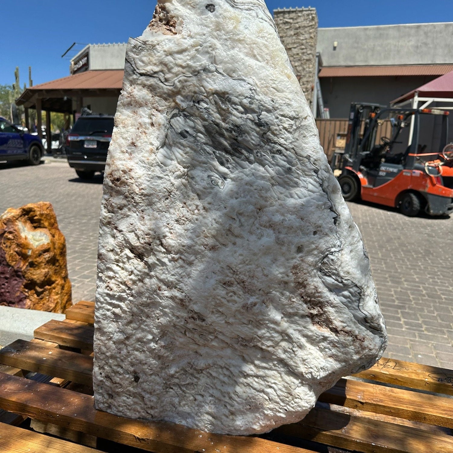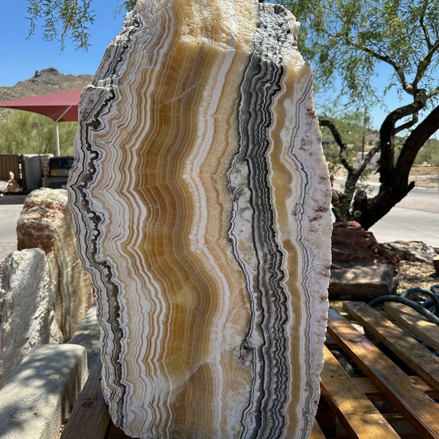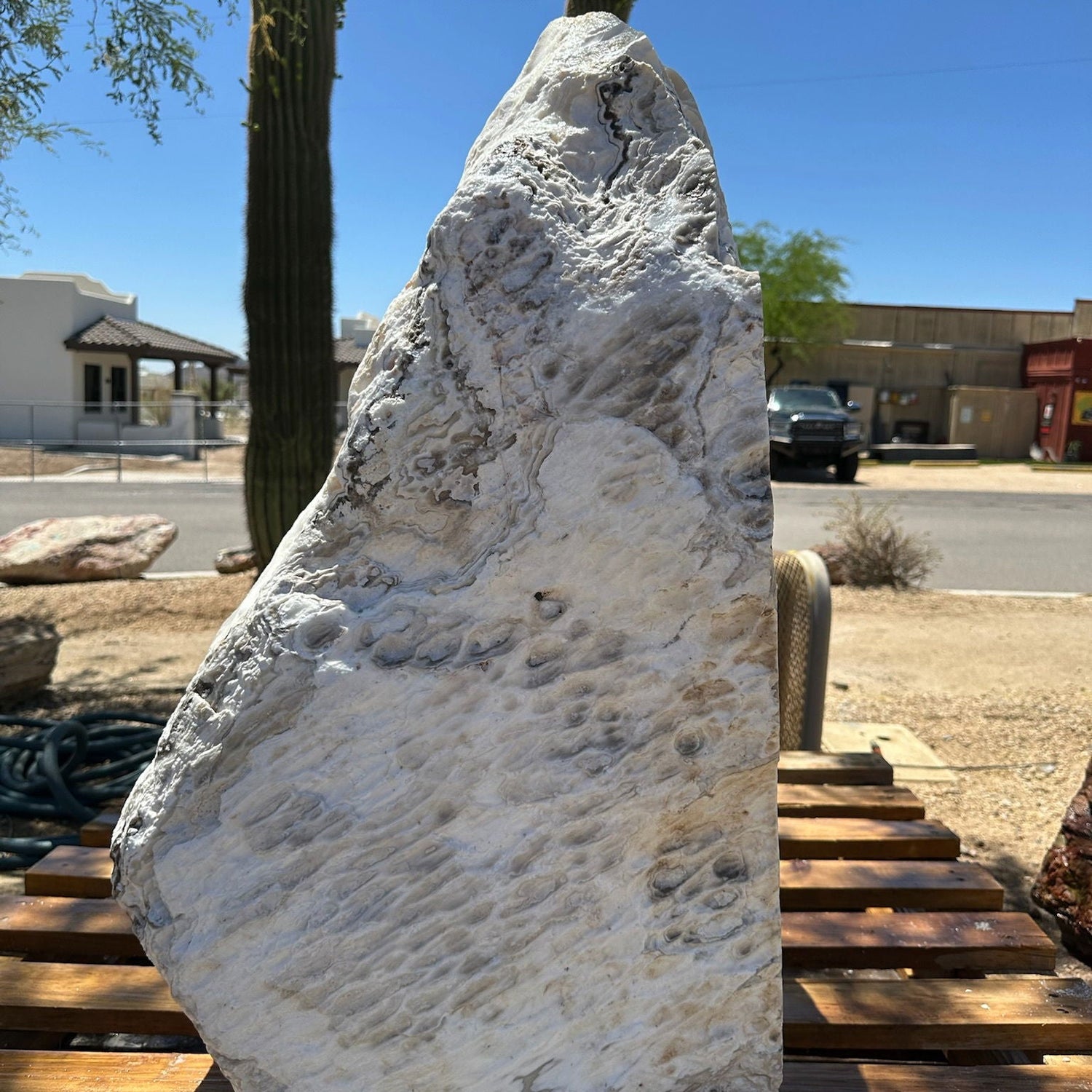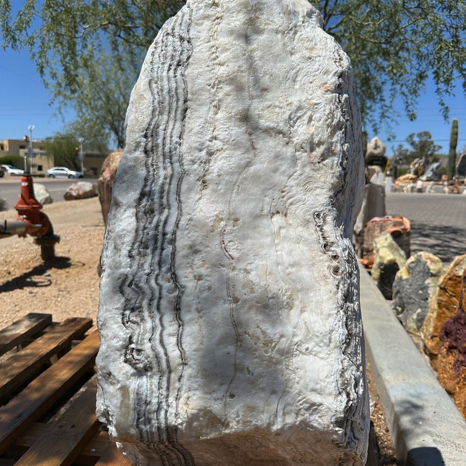 This Zebra Onyx rustic rock Fountain is a premium natural stone outdoor water feature designed for backyards, courtyards, patios, and garden landscapes. Its bold zebra-like banding and contrasting tones and a rustic rock profile that feels rugged and organic make it a striking focal point for any tranquil outdoor setting. The fountain’s flow encourages relaxation with soothing sound and movement, helping your outdoor space feel calm and inviting. Create a peaceful, eye-catching focal point for your desert landscape. Let Rare Earth Gallery’s white-glove service make your fountain dreams come true—simply choose your fountain, tell us where it goes, and we’ll handle the rest, from delivery to installation. IMPORTANT: the purchase price listed is for the FOUNTAIN ONLY and DOES NOT INCLUDE the cost of a basin, pump, parts or installation. Before purchasing a fountain online, we STRONGLY recommend you call us at (480) 575-4360 for a FREE consultation to discuss these additional costs and schedule a pre-site inspection. Also, free shipping does NOT apply to fountains, please call for a quote.