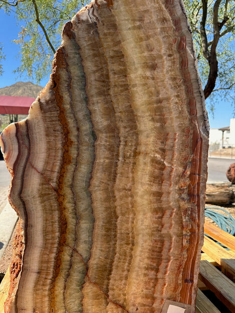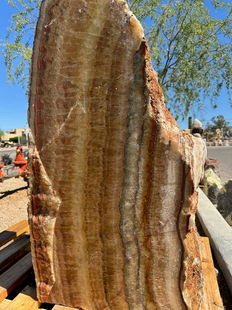 Onyx outdoor fountains are unique for their wide range of natural colors and striking visual movement within the stone. Each piece of onyx features layered banding, flowing patterns, and color variation that can include creams, honey tones, greens, ambers, and earthy reds. As water moves across the surface, these natural bands create a sense of depth and motion, making the fountain feel dynamic rather than static. No two onyx fountains are ever alike, which is why they’re often chosen as statement pieces that double as functional water features and natural works of art.