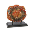 Introducing the Arizona Petrified Wood Slice on a Custom Stand. This stunning piece showcases nature's beauty with vivid pinks, reds, and browns. It's a unique and timeless collector's item, over 180 million years old. Displayed on a custom steel stand, perfect for fossil and mineral enthusiasts. A striking addition to any space.