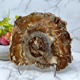 Experience the natural beauty of Madagascar with this unique petrified wood slice. Double-sided and polished, it comes with an acrylic easel for easy display. Perfect for fossil lovers and home accessory collections, this rare and one-of-a-kind wood slice is a must-have for any mineral or rock enthusiast. Discover the beauty of nature with this stunning petrified wood slice.