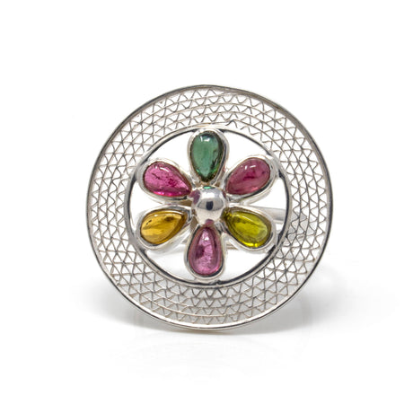 Multi Tourmaline Flower Ring - 6 Pear Cabochon Petals Set in Center Of Silver Mesh Open Circle Sz7