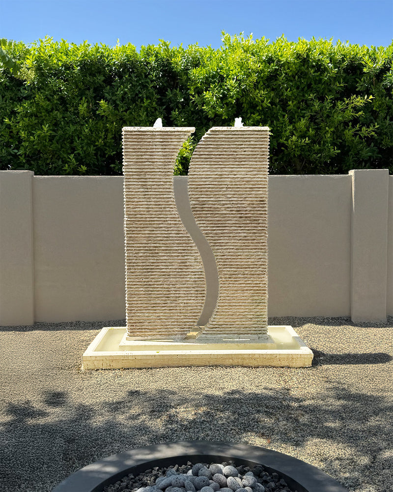 A travertine outdoor fountain's warm, porous limestone lends itself to sculptural forms—S-fountains, columns, and barrel-cactus shapes—with softly textured surfaces and gentle water flow, creating a timeless, Old World feel that blends seamlessly into desert, Mediterranean, and resort-style landscapes while aging beautifully over time.