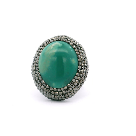 Persian Turquoise Ring -Gemmy Teal Blue Oval With Marcasite & Adjustable Double Band