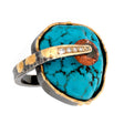 Introducing a unique Chinese Turquoise Ring, perfect for December birthdays. Crafted in oxidized sterling silver with gold vermeil accents, this ring features a hammered band with a stunning nugget of Chinese turquoise and a faceted zultanite. The band boasts 5 pave diamonds, adding a touch of elegance to the timeless design. This statement piece is sure to become a staple in your jewelry collection. Order now for a one-of-a-kind addition to your wardrobe!