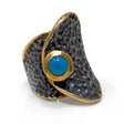 New Mexico (Campositos) Turquoise Ring - Round Cabochon with Gold Vermeil Bezel Set on Hammered Oxidized Band with "Falling Leaf" Folded Design - Gold Vermeil Size 7