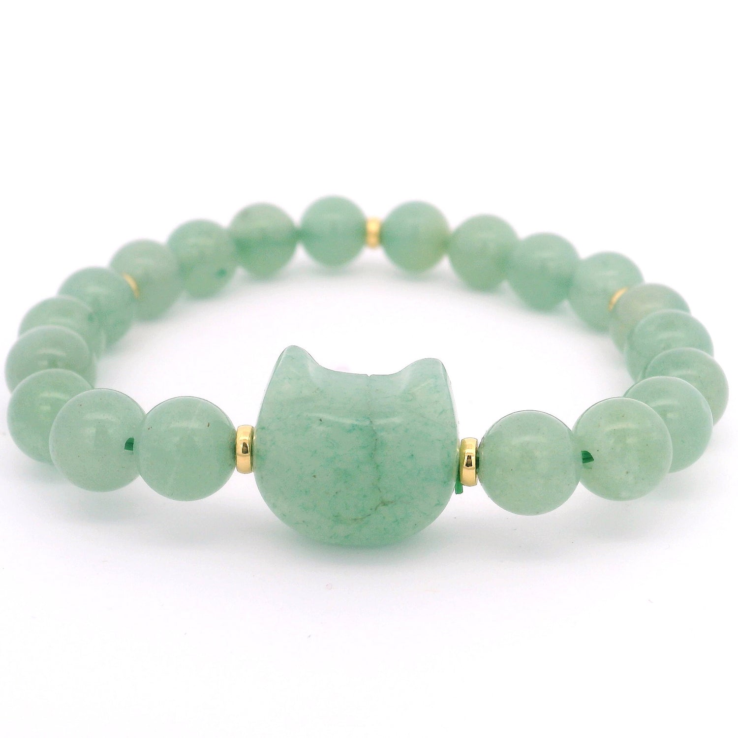 Cat Face Carved Bead & 8mm Rounds Beaded Bracelet with Gold Spacers