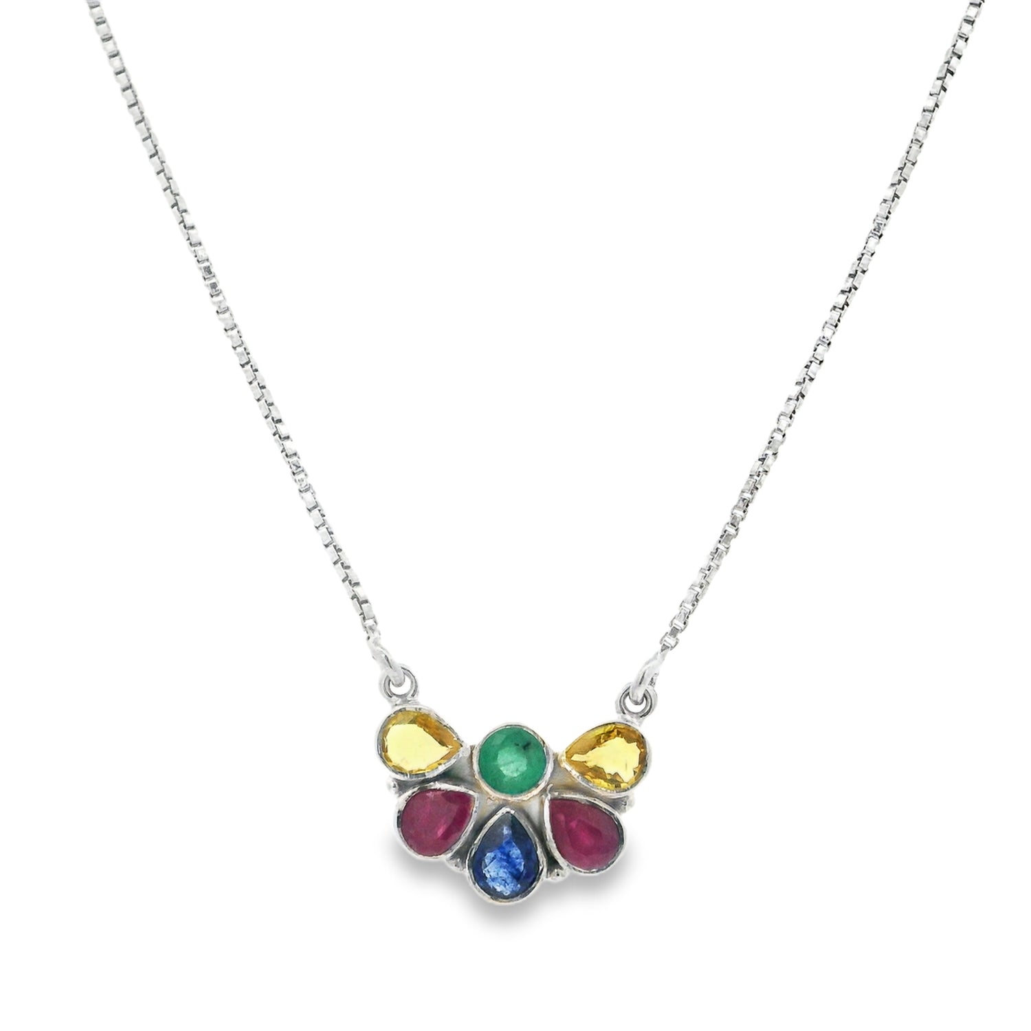 Multi Corundum Kachina Floral Design Necklace on Box Chain with Stops at 15" thru 19" - Sapphire, Emerald, Ruby is backordered and will ship as soon as it is back in stock.