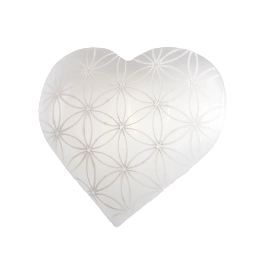 Cœur en Sélénite avec Fleur de Vie Gravée du Maroc - Géométrie Sacrée