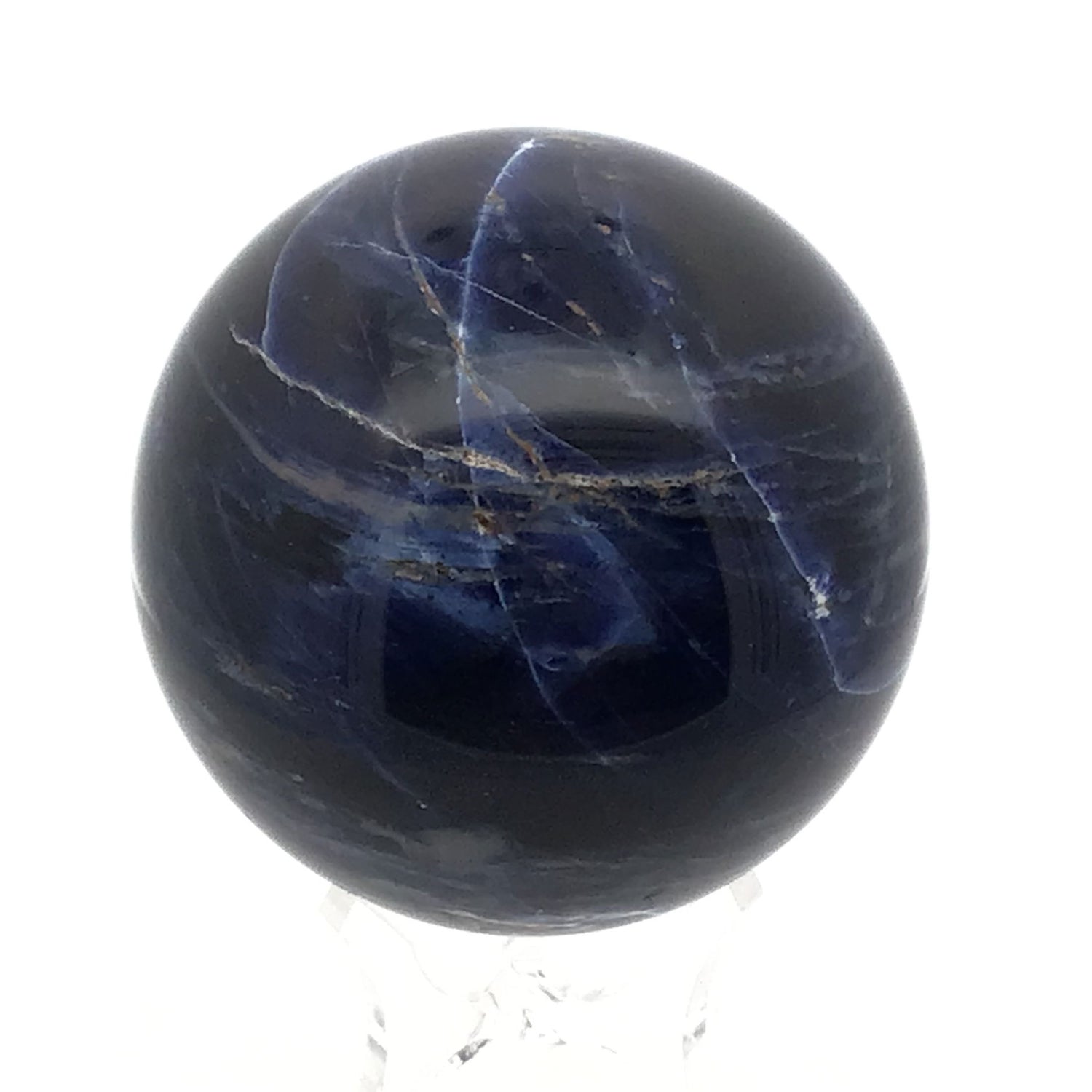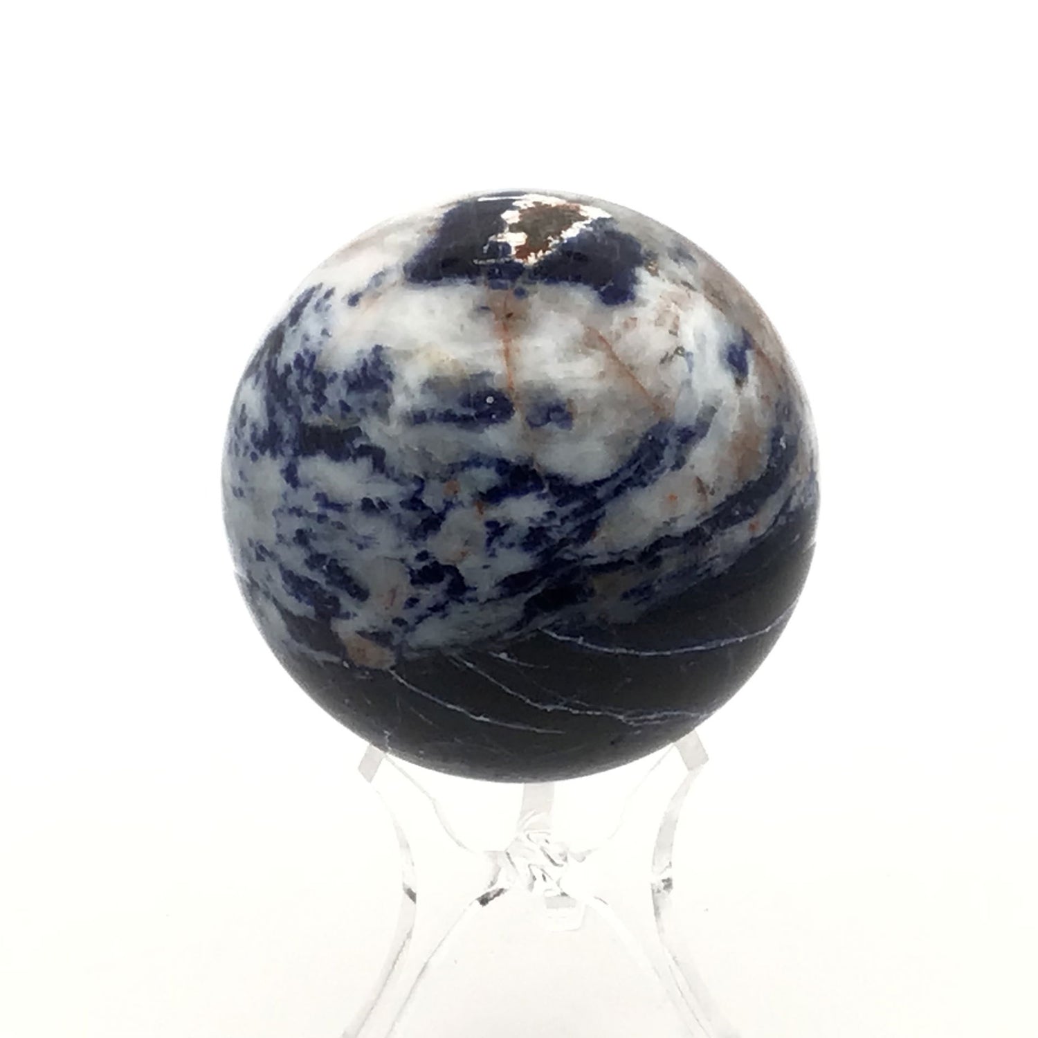 A+ Sodalite Sphere on Lucite Ring Stand - Stunning Deep Royal Blue with White Webbing & Peach Inclusions is backordered and will ship as soon as it is back in stock.